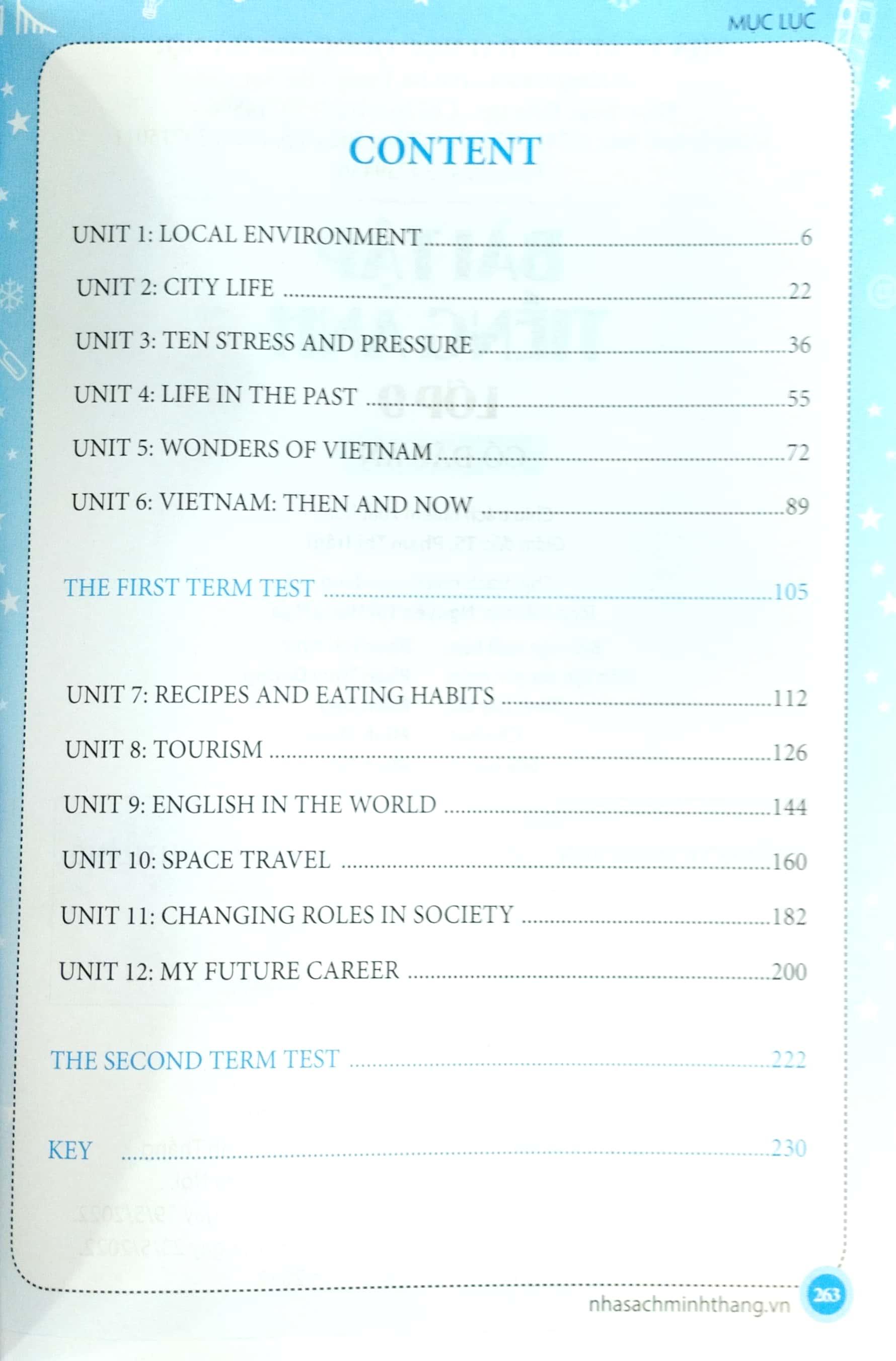 Mỗi bài học trong cuốn sách Bài tập Tiếng Anh lớp 9 được biên soạn theo chủ điểm quen thuộc với học sinh Trung học cơ sở.