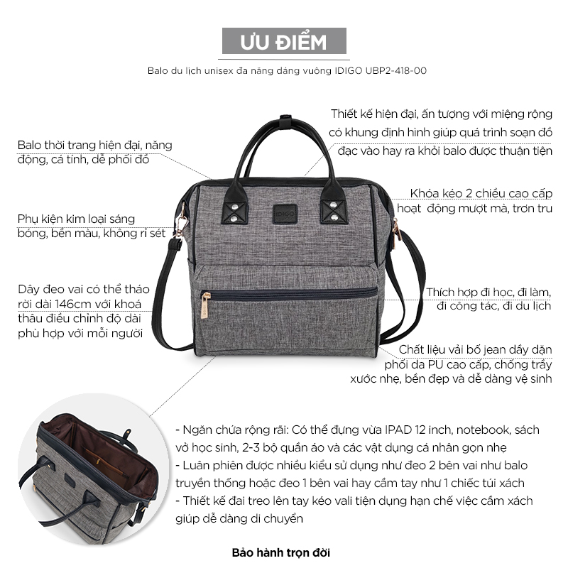 ✨Balo công sở nam nữ dáng vuông IDIGO UBP2 - 418 - 00, ba lô du lịch đa năng nhỏ gọn