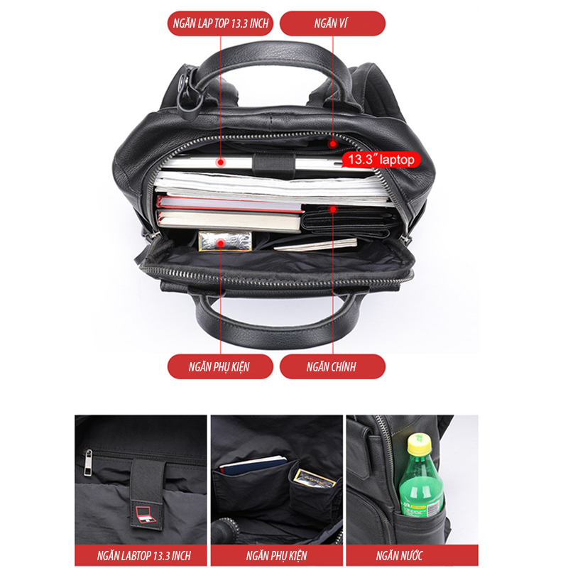 Kích thước : rộng 26cm X cao 37cm X dày 12cm Trọng lượng: 1.2 kg Dung tích: laptop 13.3 inch Màu sắc: Đen Phương pháp sản xuất: thủ công Chất liệu : Da BÒ THẬT