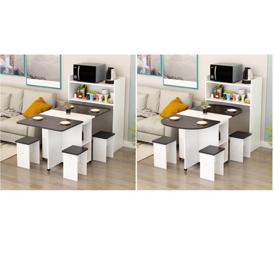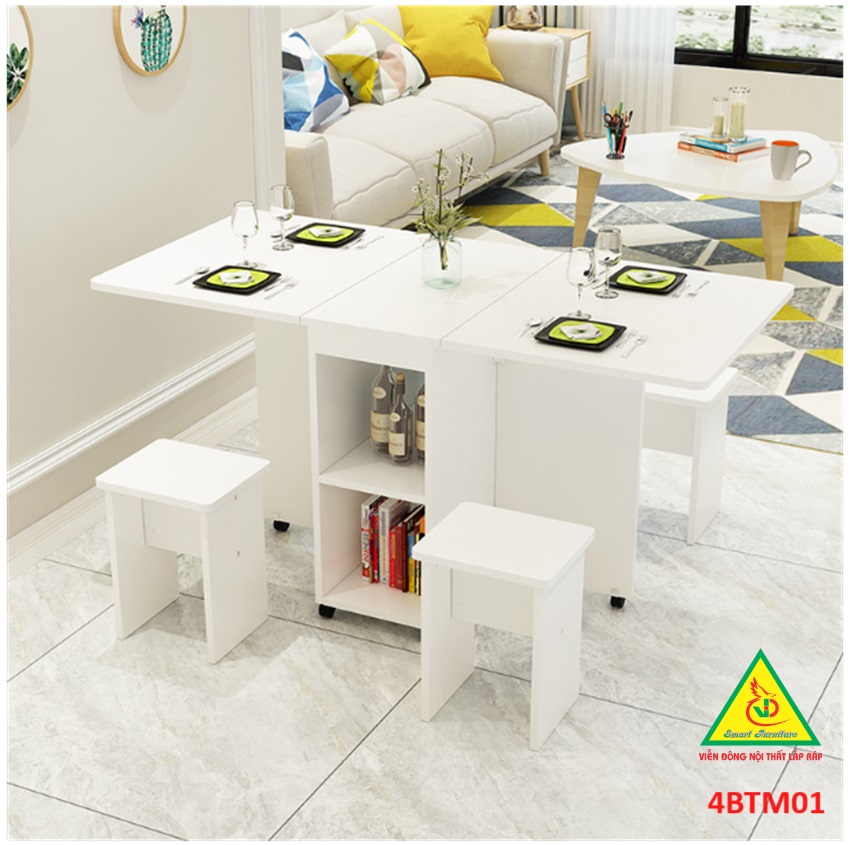Bàn ăn gấp gọn thông minh Với các gia đình có diện tích phòng ăn không lớn lắm thì Bàn ăn gấp gọn này chính là sự lựa chọn lý tưởng nhất. Bàn ăn có kích thước nhỏ gọn, kết cấu thông minh có thể gấp gọn lại khi không sử dụng tiết kiệm diện tích. Bàn được làm bằng gỗ công nghiệp MDF cao cấp phủ melamine láng mịn, tính thẩm mỹ cao thu hút được sự chú ý của khách hàng. Tích hợp 3 in 1: Bàn, Tủ và Kệ thật Sang - Chảnh - Đẳng Cấp Dù nhà lớn hay nhỏ thì chiếc Bàn Ăn Thông Minh sẽ làm không gian gọn gàng hơn, thoáng hơn và đẹp hơn.
