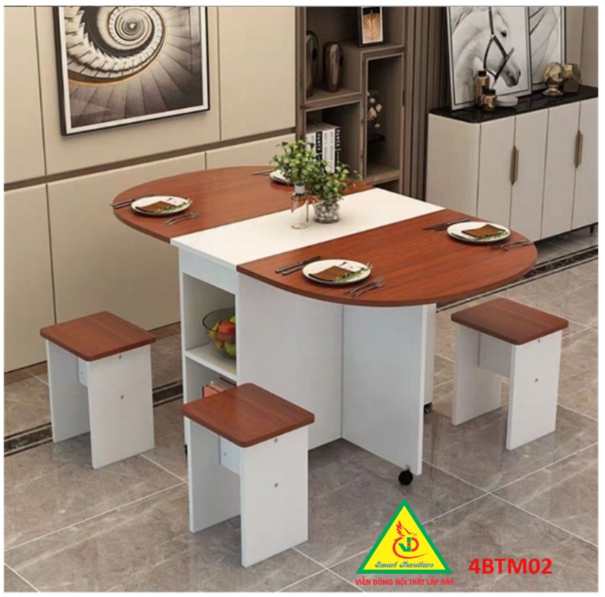 Bàn ăn gấp gọn thông minh Với các gia đình có diện tích phòng ăn không lớn lắm thì Bàn ăn gấp gọn này chính là sự lựa chọn lý tưởng nhất. Bàn ăn có kích thước nhỏ gọn, kết cấu thông minh có thể gấp gọn lại khi không sử dụng tiết kiệm diện tích. Bàn được làm bằng gỗ công nghiệp MDF cao cấp phủ melamine láng mịn, tính thẩm mỹ cao thu hút được sự chú ý của khách hàng. Tích hợp 3 in 1: Bàn, Tủ và Kệ thật Sang - Chảnh - Đẳng Cấp Dù nhà lớn hay nhỏ thì chiếc Bàn Ăn Thông Minh sẽ làm không gian gọn gàng hơn, thoáng hơn và đẹp hơn.