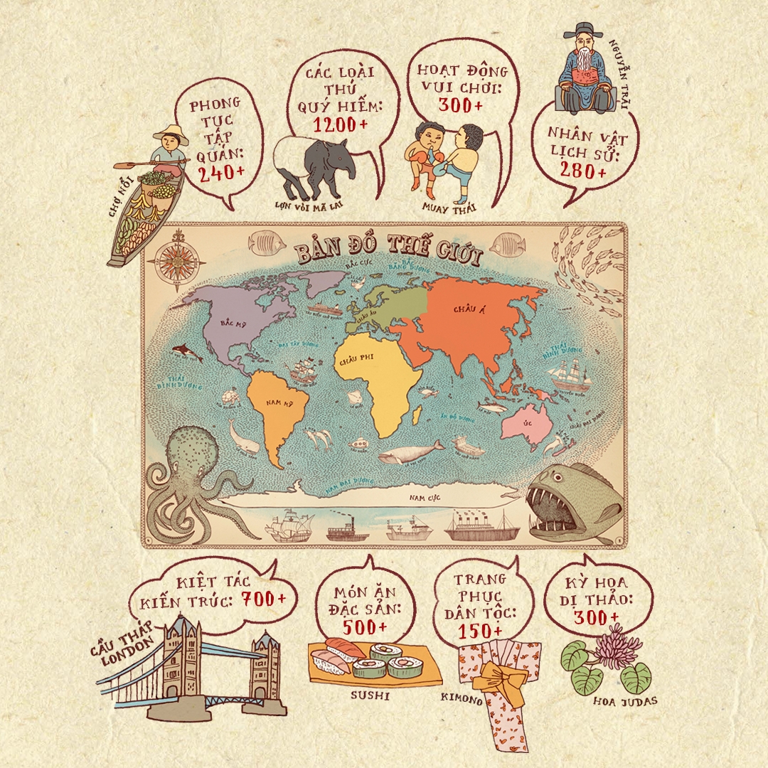 Mua tại TiktokCuốn sách này hứa hẹn sẽ là tấm vé đưa độc giả nhỏ du lịch khắp mọi miền trên thế giới. Các bậc phụ huynh cũng có thể đồng hành cùng con em mình, cùng ngâm cứu từng chi tiết trên mỗi tấm bản đồ, tìm hiểu và bàn luận về các địa phương. Thông qua việc chỉ dẫn, diễn giải cho các con về những thông tin trên bản đồ, đây sẽ là cuốn sách tương tác tốt để bố mẹ kết nối và gần gũi với con mình hơn.