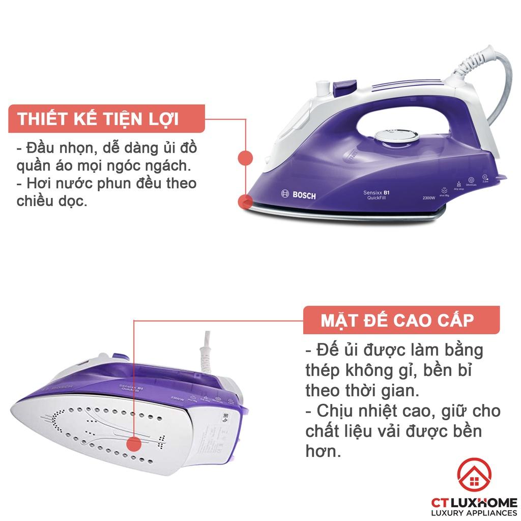 Mua tại TiktokBàn là hơi nước Bosch TDA2651GB là thiết bị phun sương trong quá trình là ủi quần áo nhằm xóa bỏ các nếp nhăn không đáng có do nhiệt gây ra. ️ ĐIỂM ĐẶC TRƯNG NỔI BẬT CỦA BÀN ỦI HƠI NƯỚC BOSCH TDA2651GB