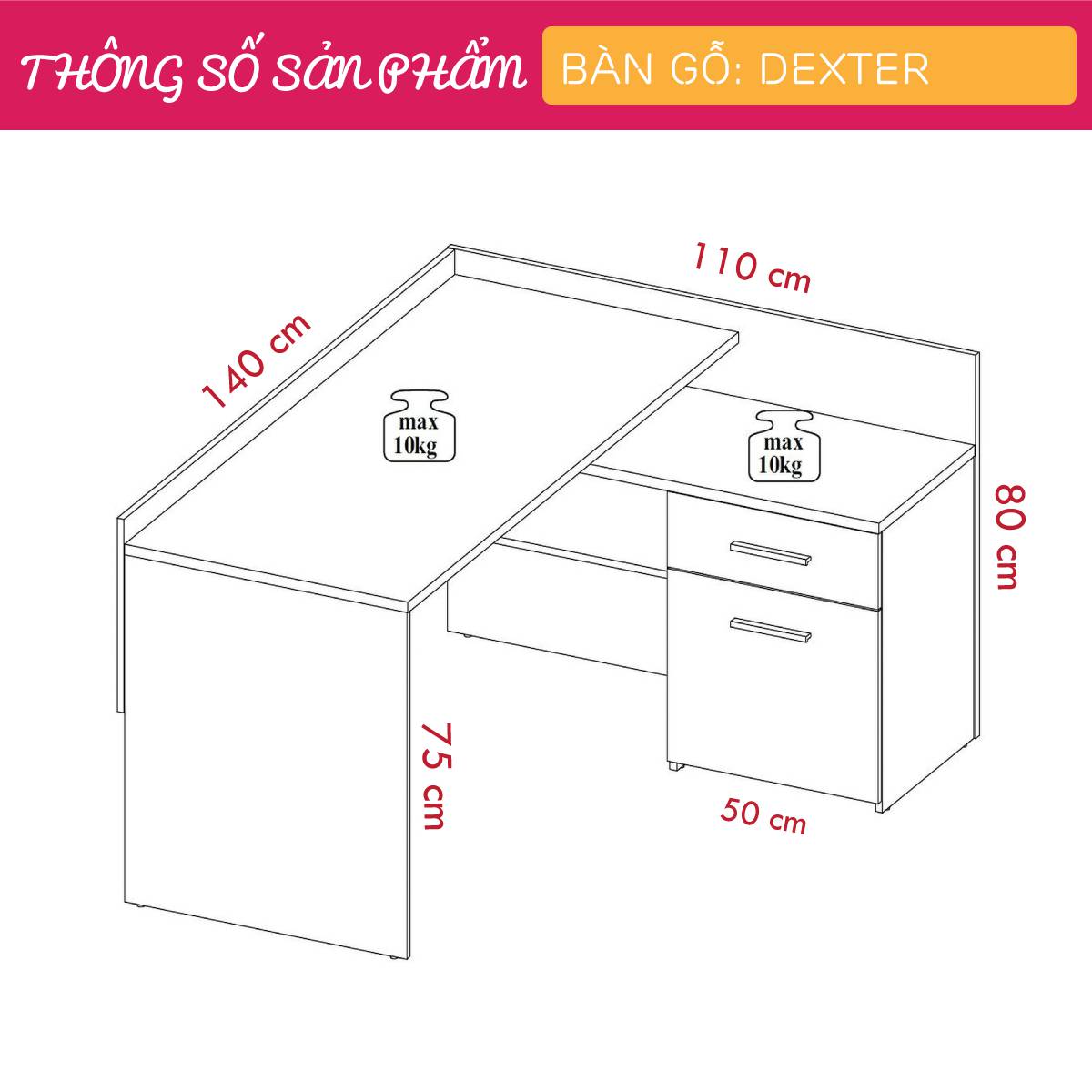 Mua tại TiktokMang đậm phong cách nội thất đơn giản, bàn làm việc gỗ Dexter là một sự bổ sung hoàn hảo cho phòng làm việc, phòng đọc sách của bạn. Bàn làm việc Dexter được thiết kế với nhiều tầng kệ và ngăn kéo mang đến nhiều không gian giúp bạn tổ chức sách vở và các vật dụng trang trí thoải mái. Sản phẩm là một giải pháp phù hợp cho những văn phòng hoặc căn hộ diện tích nhỏ. Sử dụng vật liệu ván ép công nghiệp MDF chống ẩm phủ Melamine cao cấp giúp bàn làm việc, bàn học gỗ SMLIFE có độ bền cao, chống trầy và chống ẩm rất tốt. Bạn có thể tự lắp đặt sản phẩm dễ dàng với các phụ kiện và hướng dẫn đi kèm.