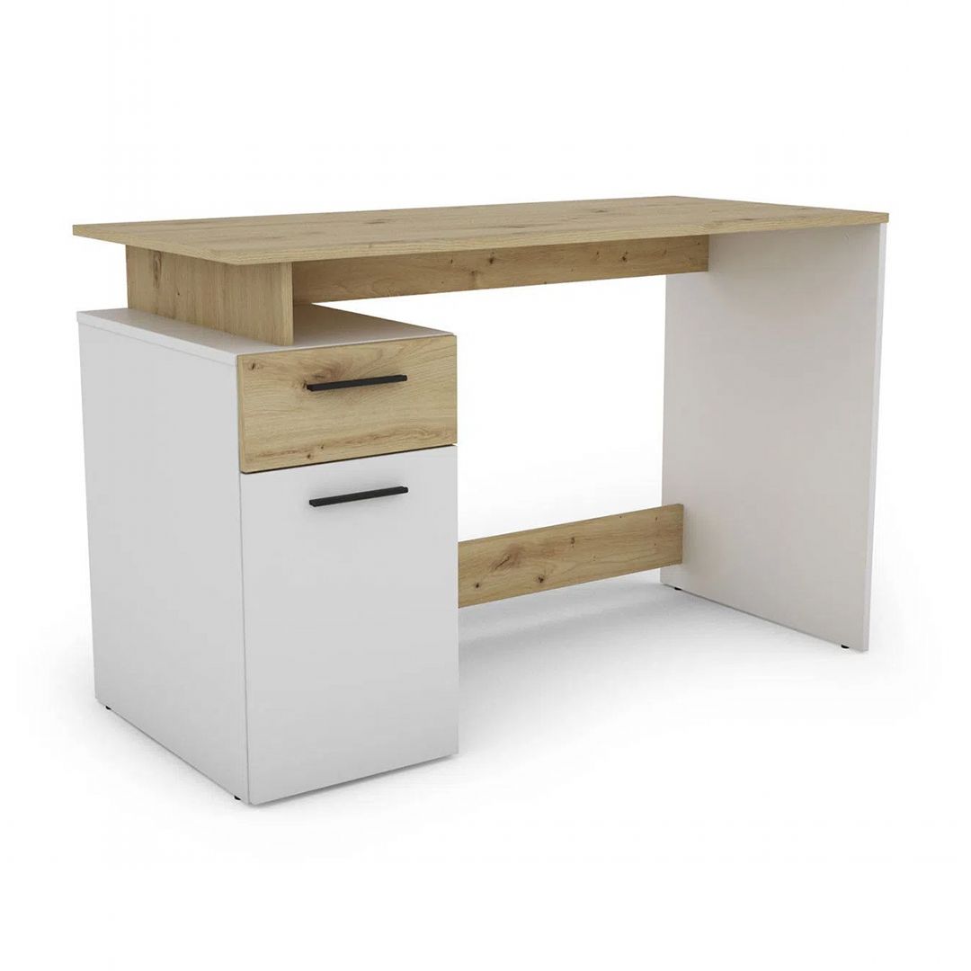- Tên sản phẩm: Bàn làm việc kèm ngăn kéo và kệ để đồ - Chất liệu: Gỗ MDF phủ melamine cao cấp chống xước - chân bàn gỗ tự nhiên - Màu sắc: Vân gỗ sồi - Kích thước: 80/120 x 55 x 82cm (dài x rộng x cao) - Công năng: Là mẫu bàn làm việc, bàn học giúp tiết kiệm diện tích không gian phòng