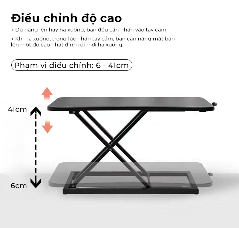 Bàn 1 tầng: Mặt bàn 60x34cm, độ cao tuỳ chỉnh 6 - 41cm.