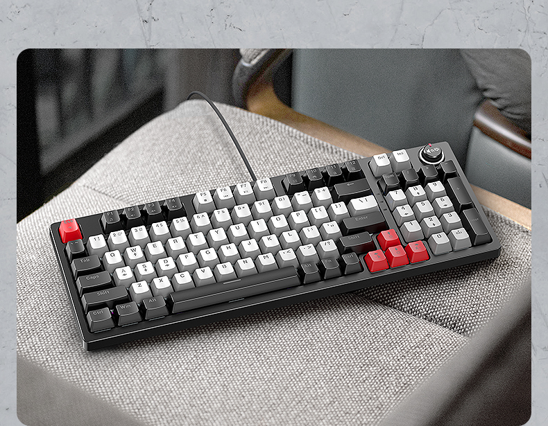 Góc trái trên cùng của T-Wolf T50 được trang bị nút xoay điều chỉnh âm thanh/ độ sáng đầy tiện ích, đây là điểm độc đáo tạo ra sự khác biệt của bàn phím cơ T50 Blue Switch.