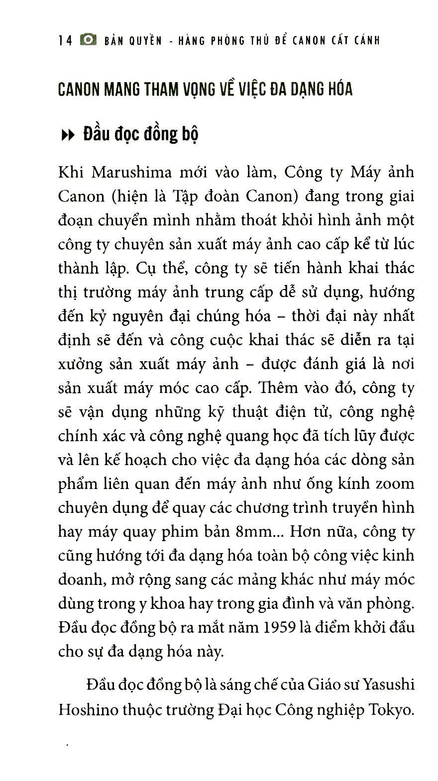 Trong Bản quyền – Hàng phòng thủ để Canon cất cánh, Giichi Marushima sẽ kể lại những kinh nghiệm của bản thân trong suốt 40 năm hoạt động trong lĩnh vực bằng sáng chế, đồng thời chia sẻ những suy nghĩ và ý kiến cá nhân về chiến lược sở hữu trí tuệ – chiến lược sẽ thu hút được các doanh nghiệp Nhật Bản. Từ đó chúng ta sẽ hiểu được sở hữu trí tuệ đã giúp Canon trở thành một tập đoàn đa quốc gia hùng mạnh như thế nào? Và chúng ta có thể học được gì từ đó.