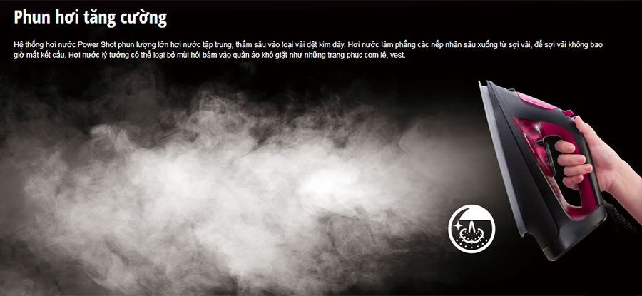 Bàn ủi trang bị 27 lỗ thông dọc theo rãnh chữ U tản đều trên mặt đế giúp tăng hiệu suất tạo hơi nước, hệ thống hơi nước Power Shot phun lượng lớn hơi nươc tập trung, giúp làm mềm vải và làm phẳng các nếp nhăn nhanh chóng và còn có thể loại bỏ mùi hôi bám vào quần áo khó giặt như những trang phục comle, Hình dạng đế độc đáo với các cạnh tròn và cấu tạo đế viền cong giúp ủi áo không bị vướng, không làm cho vải co lại, cho việc là quần áo 1 cách dễ dàng và thoải mái.