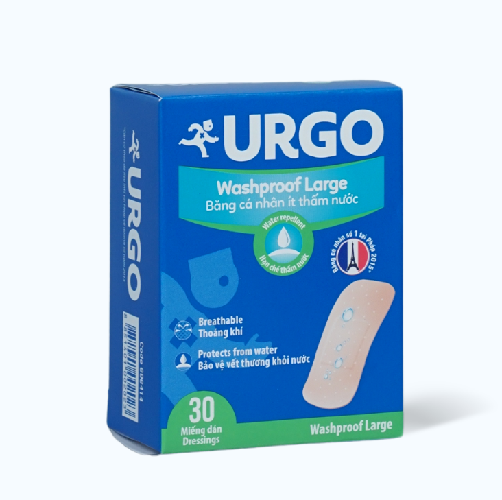 ✨Băng cá nhân ít thấm nước URGO Washproof Large bảo vệ vết thương khỏi nước 3.8cm x 7.2cm (30 miếng)
