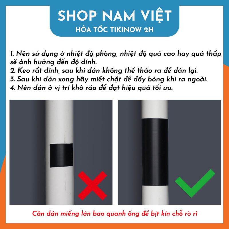 Mua tại TiktokBăng Keo Cao Su Vá Ống Nước, Vá Thau Chậu, Đệm Hơi Tức Thì Đóng gói: 1 cuộn keo cao su PVC ️ Tính năng Băng keo với tính năng chuyện dụng để vá ống nước, thau chậu, đệm hơi, hồ cá và các sản phẩm bằng nhựa, kính khác. Chỉ sử dụng được ở nhiệt độ dưới 40 độ C. Băng keo chống thấm nước, có thể dán được ở nơi ẩm ướt. Lớp keo siêu dính dày chắc, chỉ cần áp vào là dính ngay lập tức. ️ Thông số Chất liệu: cao su tổng hợp PVC Kích thước: bản rộng 5cm hoặc 10cm. Cuộn dài 150cm. ️ Cách sử dụng: Dán ở nhiệt độ không quá lạnh và không quá nóng. Cắt một miếng lớn đủ để bao quanh ống nước chứ không chỉ chỗ hở. Khi đã dán không thể tháo ra để dán lại. Sau khi dán, miết chặt để ép bóng khí ra ngoài.