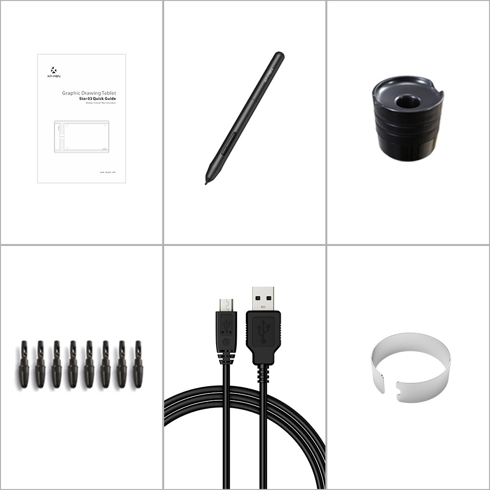 Khả năng sáng tạo rộng mở với XP-Pen Star03, bảng vẽ điện tử chuyên nghiệp 12 inch (10x6 inch). 8 phím tắt tùy chỉnh tính năng giúp thao tác nhanh chóng và tăng hiệu quả công việc. XP-Pen Star03 mỏng chỉ 8mm, thật gọn ghẽ và tiện lợi khi muốn kẹp chung với chiếc laptop để sẵn sàng cùng bạn sáng tạo ở bất cứ đâu bạn muốn. Bản nâng cấp với lực nhấn 8192 mức cùng độ nhạy 266 RPI giúp biến Star 03 phiên bản 2 thành trợ thủ đắc lực của bạn với mức giá siêu hấp dẫn so với những giá trị tuyệt vời mà một chiếc bảng vẽ có thể đem lại! Bút không pin, không sạc cao cấp Stylus P01 được thiết kế công thái học (ergonomi) cho cảm giác vẽ mượt mà như khi dùng với giấy và bút chì. Bút không cần sạc hay dùng pin giúp tiết kiệm chi phí, tiện lợi, lại bảo vệ môi trường. Nút bấm trên thân bút cho phép chuyển đổi chế độ Brush và Eraser nhanh chóng, giúp quá trình sáng tác hiệu quả hơn. Vẽ mượt mà & chính xác Tính năng chống rung thông minh cùng lực nhấn bút 8192 levels đem lại trải nghiệm vẽ thoải mái và dẹp bỏ âu lo. Cảm ứng 8192 mức lực nhấn cho phép vẽ nhiều đường nét với bề rộng cũng như đậm nhạt khác nhau, phù hợp với tay trái lẫn tay phải. Thêm không gian sáng tạo Bề mặt 12 inch trơn mịn để phù hợp cả khi nhìn nghiêng. Với vùng vẽ 10x6 inch, XP-Pen Star 03 mỏng hơn nhưng lợi hại hơn, nhạy bén hơn để bạn thể hiện tất cả kỹ năng sáng tạo. Các cạnh đọc bo cong để bạn vẽ thêm cảm giác thoải mái. 8 Phím tắt tùy chỉnh mọi thao tác 8 nút bấm có thể thiết lập mọi thao tác phím tắt giúp tối thiểu nhu cầu dùng bàn phím ngoài, hỗ trợ các tính năng chỉnh sửa bạn hay xài và các tổ hợp phím khác như Ctrl+S (Save), Ctrl+X (Undo), từ đầu, XP-Pen Star 03 đã được thiết lập các tính năng mặc định: Brush enhance/weaken, zoom-in/out, Undo, hand tool, brush tool, erase, tuy nhiên bạn có thể vào driver của máy để chỉnh lại. Hỗ trợ cả phím tắt như khi cần mở nhanh một chương trình hay website nào đó. Tương thích với hầu hết hệ điều hành và các ứng dụng vẽ Driver XP-Pen Star 03 có thể làm việc với Windows 10/8/7/Vista, Mac OS 10.8 trở lên và tất cả các ứng dụng đồ họa thông dụng như Photoshop, Painter, Adobe Illustrator, Bạn cũng có thể dùng để viết tay, ghi chú thích với Microsoft Word, Pen Commander, Auto Pen Signer, để tiết kiệm thời trang theo phong cách mới thật nổi bật. THÔNG TIN CHI TIẾT Tên sản phẩm: Bảng vẽ điện tử XP-Pen Star 03 Công nghệ: Electromagnetic Digitizer Pen : Passive (không cần pin hay sạc điện) Lực nhấn bút: 8192 mức Độ nhạy: 266 RPI Resolution: 5080 LPI Độ chính xác: ±0.01 Inch Điện thế đầu vào: DC 5V Hỗ trợ kết nối: USB Chiều dài cáp kết nối:150 CM Tương thích với: Windows 7/8/10/, Mac OS 1.7 hoặc cao hơn.   Hộp sản phẩm bao gồm: 1 x Tablet 8 x Ngòi dự phòng 1 x Đế gác bút 1 x Passive Pen Stylus 1 x Cáp USB 1 x Sách hướng dẫn 1 x Đồ gắp ngòi bút