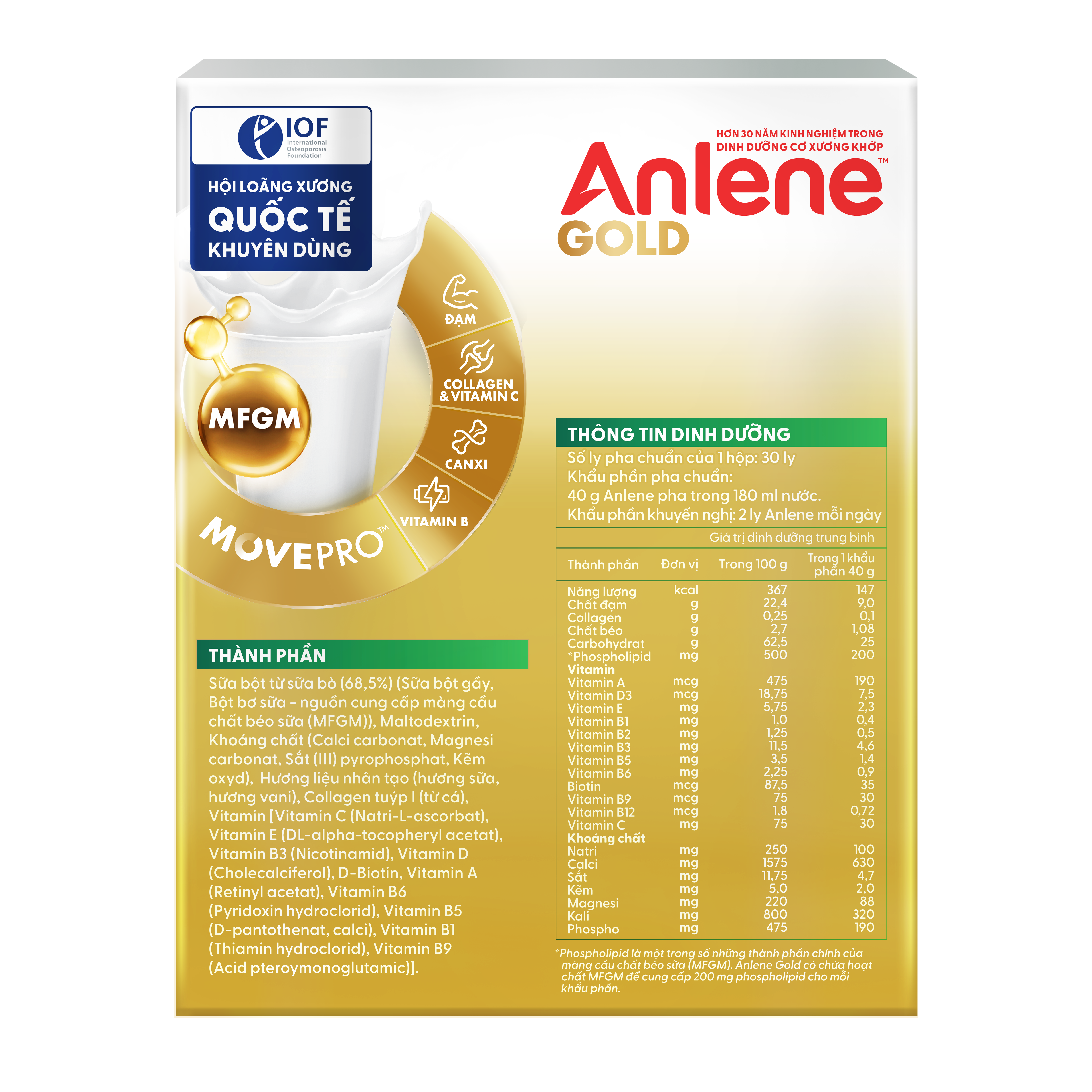 SỮA ANLENE GOLDAnlene Gold là sản phẩm sữa chứa hệ dưỡng chất MovePro cung cấp dinh dưỡng tăng cường với hoạt chất MFGM được KIỂM NGHIỆM LÂM SÀNG giúp cơ thể thêm linh hoạt và