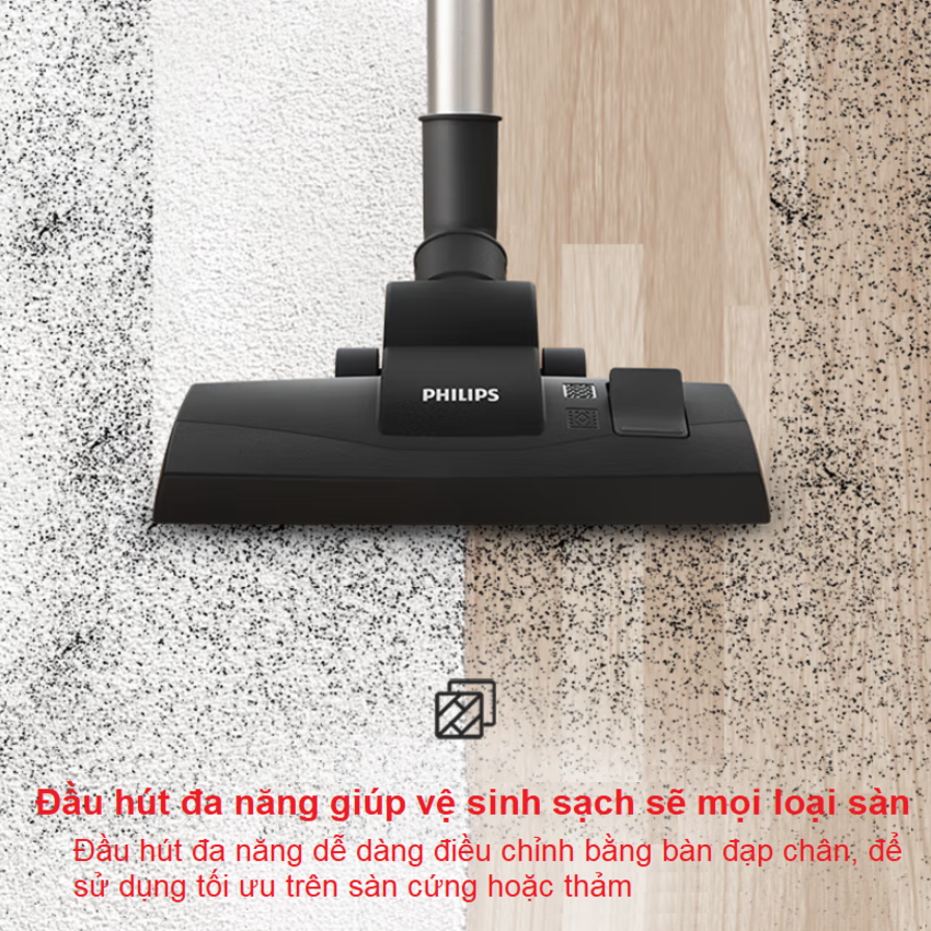 • Đầu hút đa năng có thể dễ dàng điều chỉnh bằng bàn đạp chân, để sử dụng tối ưu trên sàn cứng hoặc thảm. Ngăn chứa bụi được thiết kế để đổ sạch bụi hợp vệ sinh bằng một tay