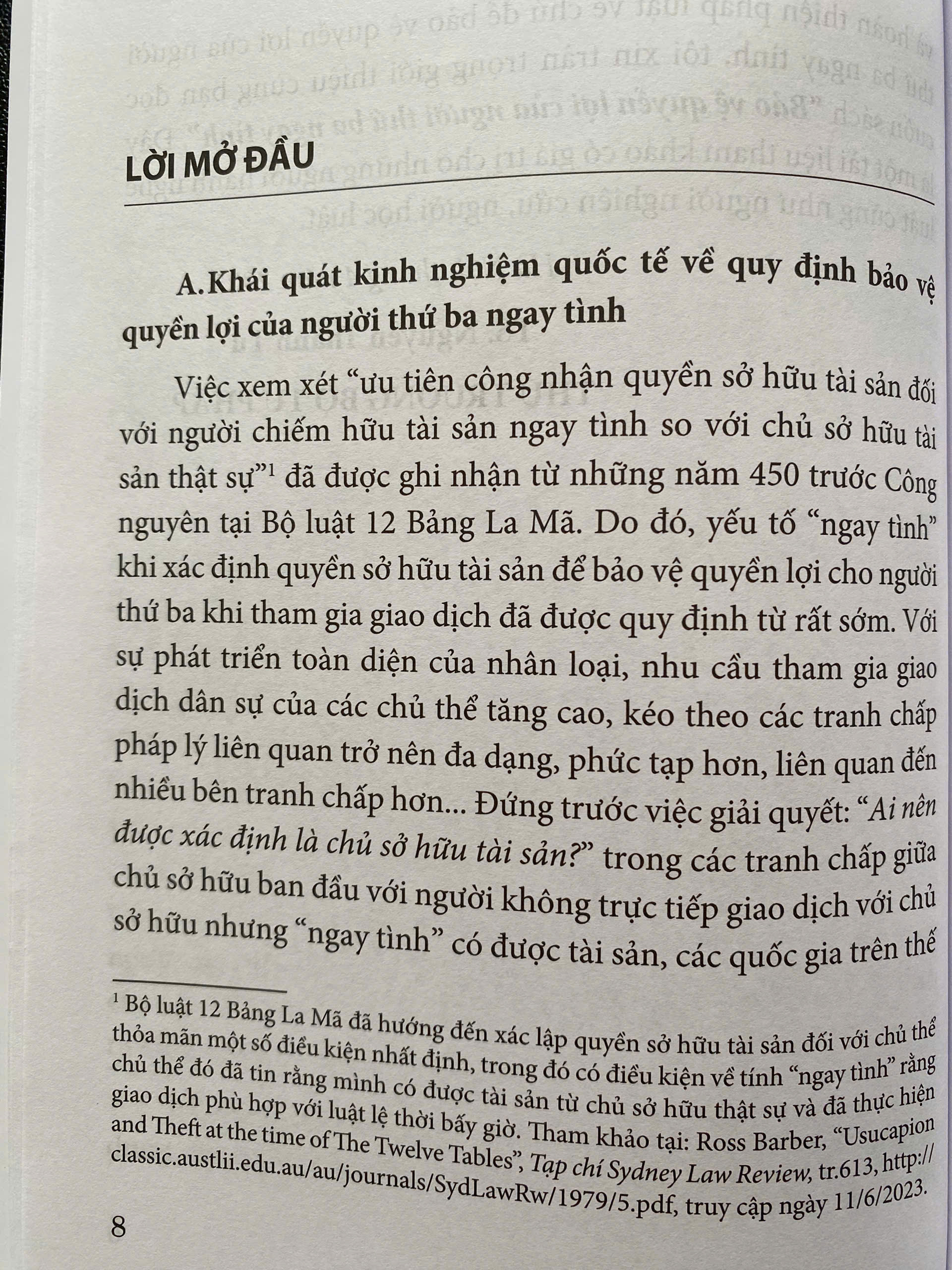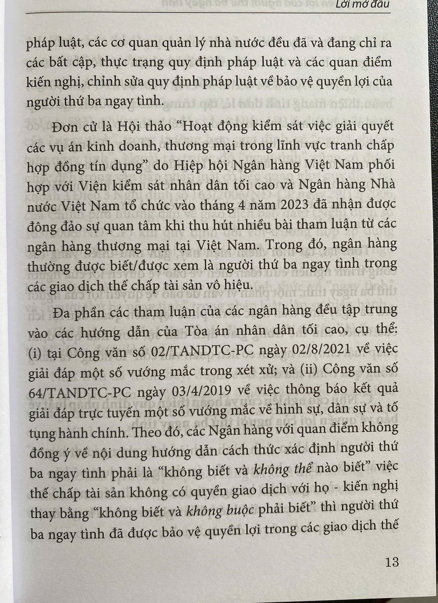 Việc xây dựng và hoàn thiện nhà nước pháp quyền xã hội chủ nghĩa, trong đó có hoàn thiện thể chế kinh tế thị trường định hướng xã hội chủ nghĩa, là một trong những nhiệm vụ trọng tâm, đột phá chiến lược, được xác định rõ trong Văn kiện Đại hội XIII của Đảng (năm 2021) và Nghị quyết số 27-NQ/TW ngày 09/11/2022 của Hội nghị lần thứ sáu Ban Chấp hành Trung ương Đảng khóa XIII. Trong bối cảnh đó, việc bảo vệ quyền lợi của người thứ ba ngay tình là hết sức quan trọng, góp phần bảo đảm tính ổn định, an toàn và giảm thiểu chi phí của các giao dịch dân sự, qua đó góp phần bảo đảm thượng tôn Hiến pháp, pháp luật và hoàn thiện nhà nước pháp quyền. Bảo vệ quyền lợi của người thứ ba ngay tình không phải là vấn đề mới, nhưng luôn mang tính thời sự, phụ thuộc vào thực tiễn sôi động của đời sống kinh tế, xã hội. Ở Việt Nam, chế định bảo vệ quyền lợi của người thứ ba ngay tình đã được hoàn thiện trong Bộ luật Dân sự năm 2015 nhưng việc áp dụng trong từng vụ việc cụ thể trong thực tiễn vẫn có thể còn gây nhiều tranh luận. Ví dụ, quan điểm và cách tiếp cận xử lý quan hệ dân sự trong các vụ án hình sự trong một số vụ việc, cụ thể là áp dụng Điều 133 Bộ luật Dân sự năm 2015 (về bảo vệ quyền lợi của người thứ ba ngay tình khi giao dịch dân sự vô hiệu) và Điều 47 Bộ luật Hình sự năm 2015, sửa đổi, bổ sung năm 2017 (về tịch thu vật, tiền trực tiếp liên quan đến tội phạm) trong một số trường hợp còn chưa thống nhất. Do đó, việc tiếp tục nghiên cứu lý luận và thực tiễn của các khía cạnh pháp lý về bảo vệ quyền lợi của người thứ ba ngay tình là hết sức cần thiết, không chỉ cho người nghiên cứu, người học luật mà cả những người làm thực tiễn, như Thẩm phán, Luật sư, Công tố viên, Điều tra viên... và những người tham gia xây dựng chính sách, pháp luật. Cuốn sách chuyên khảo "Bảo Vệ Quyền Lợi Của Người Thứ Ba Ngay Tình" do Tiến sĩ Đặng Thanh Hoa làm chủ biên là một đóng góp có giá trị ở cả phương diện lý luận và thực tiễn. Cuốn sách này đã phân tích các khía cạnh của việc bảo vệ quyền lợi của người thứ ba ngay tình một cách hợp lý, toàn diện; có so sánh với pháp luật của một số nước trên thế giới, xem xét thực tiễn áp dụng tại Việt Nam; từ đó đưa ra một số kiến nghị, đề xuất có giá trị từ nhiều góc độ. Một trong những thành công của Cuốn sách là đã trình bày và đánh giá, phân tích nhiều vụ việc cụ thể ở Việt Nam hết sức ngắn gọn, rõ ràng; từ đó giúp người đọc hiểu rõ hơn việc áp dụng pháp luật cũng như lý luận của vấn đề bảo vệ quyền lợi của người thứ ba ngay tình và rút ra kinh nghiệm cho bản thân. Với mong muốn tăng cường chất lượng, hiệu quả trong áp dụng, thi hành pháp luật; đẩy mạnh việc nghiên cứu, trao đổi  và hoàn thiện pháp luật về chủ đề bảo vệ quyền lợi của người thứ ba ngay tình, tôi xin trân trọng giới thiệu cùng bạn đọc cuốn sách "Bảo Vệ Quyền Lợi Của Người Thứ Ba Ngay Tình". Đây là một tài liệu tham khảo có giá trị cho những người hành nghề luật cũng như người nghiên cứu, người học luật. Luatvietbook xin trân trọng giới thiệu cuốn sách đến bạn đọc!