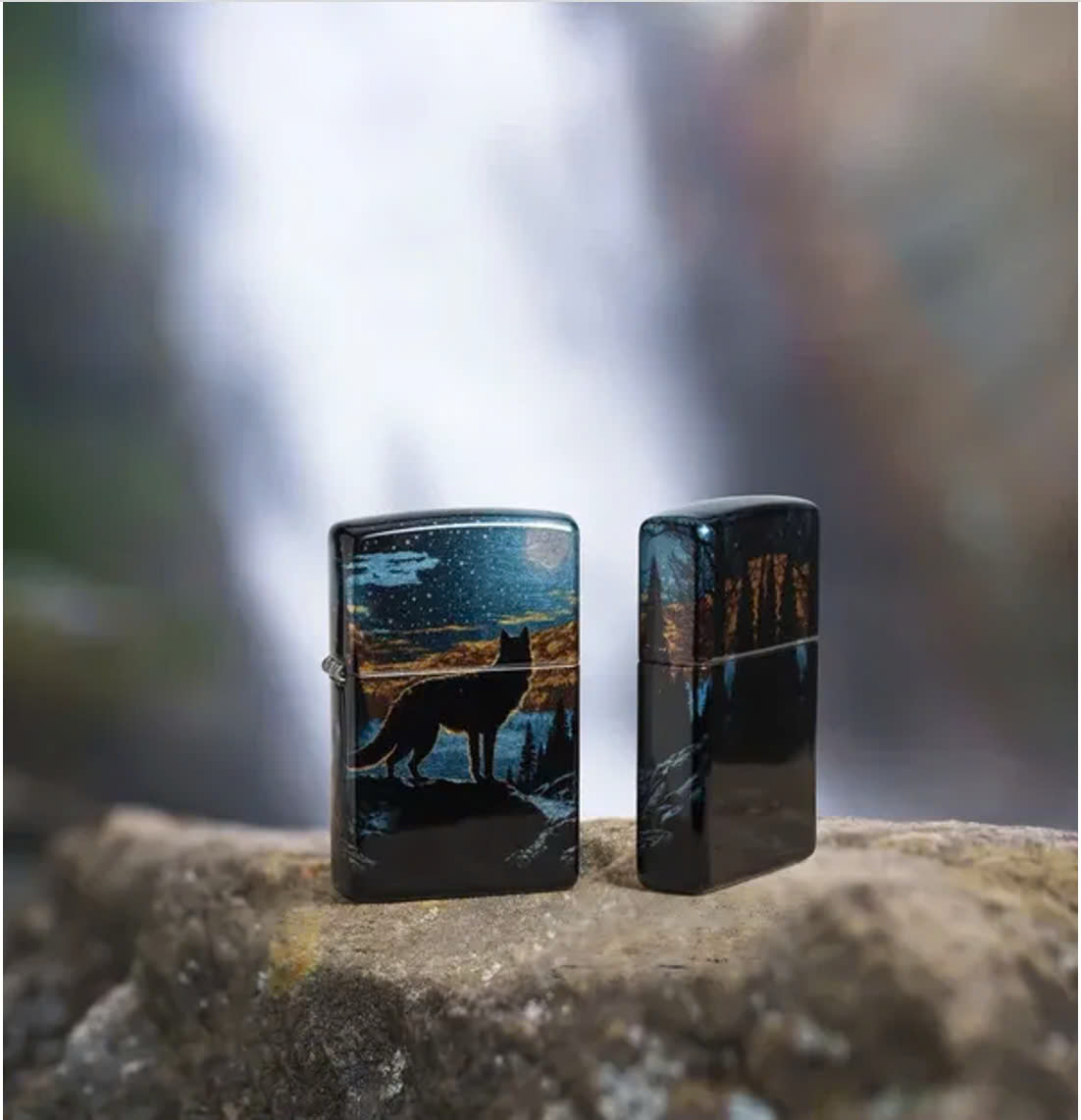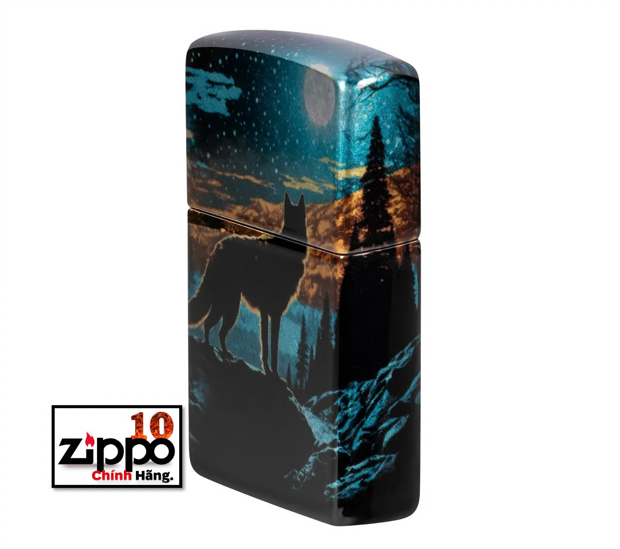 Một con sói đơn độc nhìn chằm chằm vào quang cảnh dưới ánh trăng trên chiếc bật lửa Tumbled Chrome cổ điển này với thiết kế 540 Fusion rực rỡ. Được đóng gói trong hộp quà tặng. Để có hiệu suất tối ưu, hãy đổ đầy nhiên liệu bật lửa Zippo.