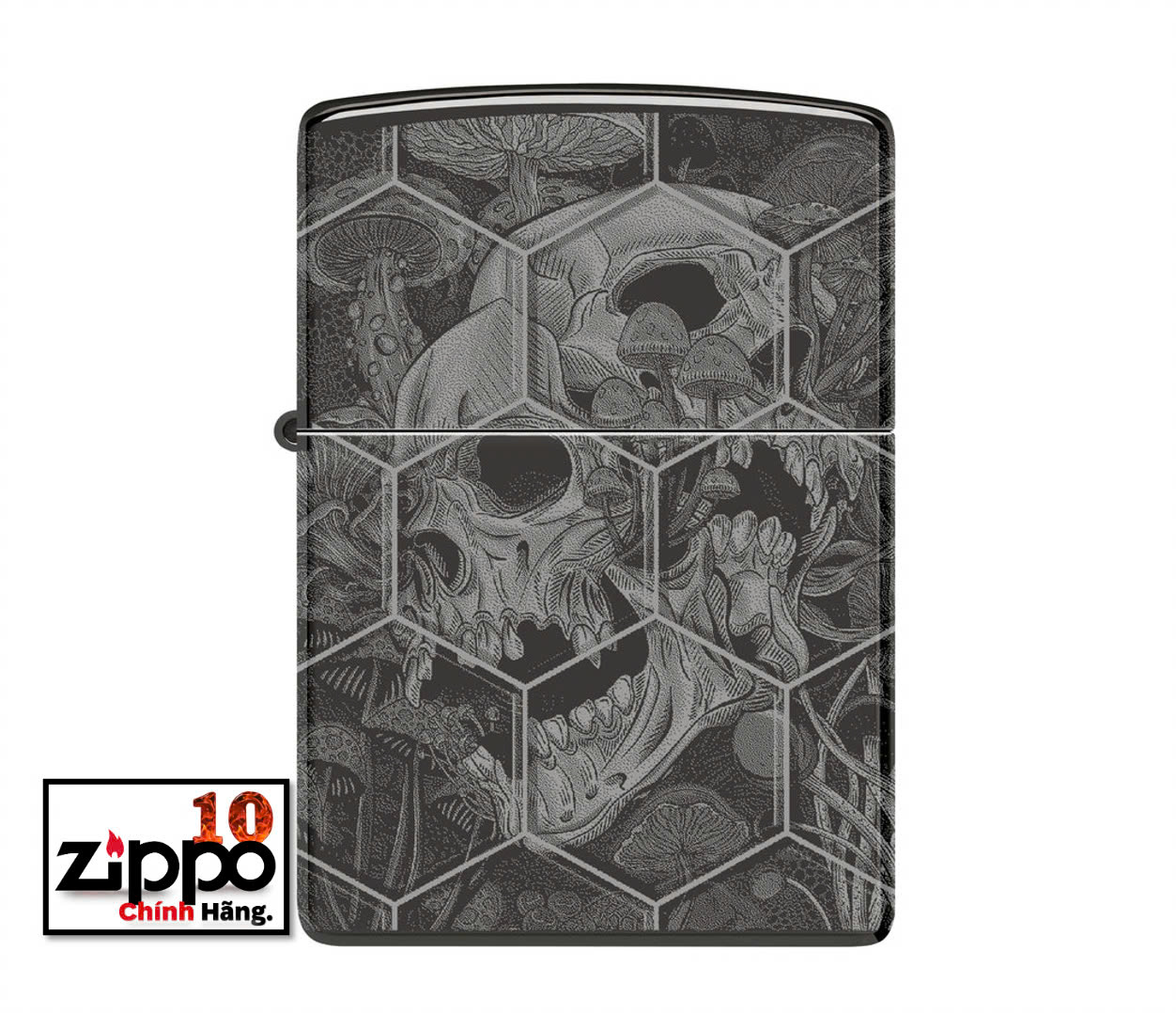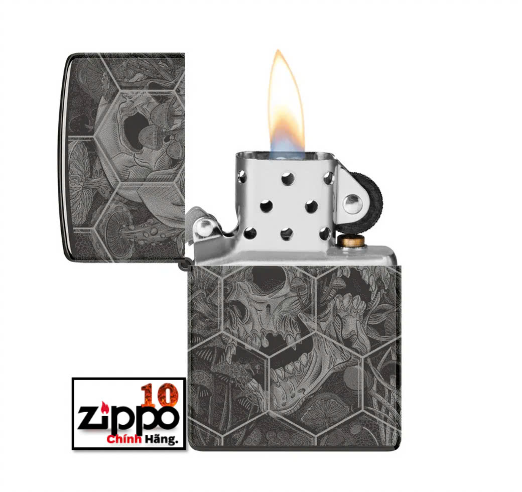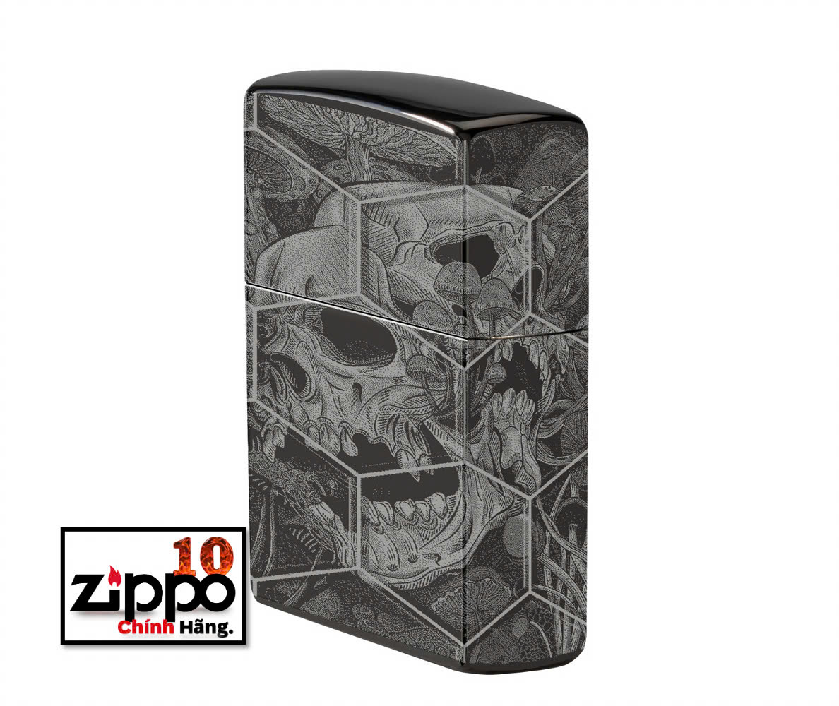 Được đóng khung theo họa tiết tổ ong phức tạp, nấm mọc ra từ những hộp sọ đang phân hủy trên mọi bề mặt của chiếc bật lửa High Polish Black cổ điển này với