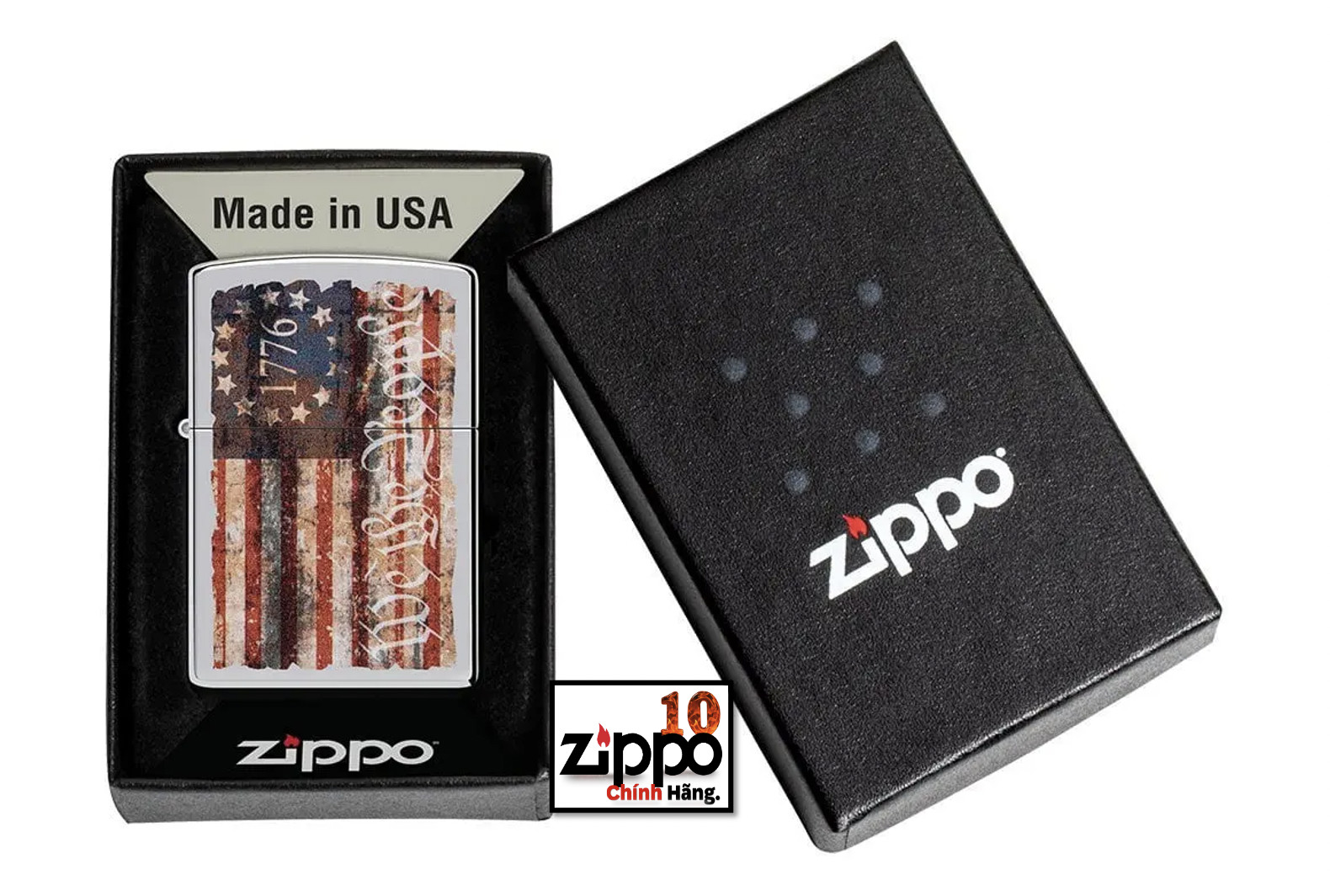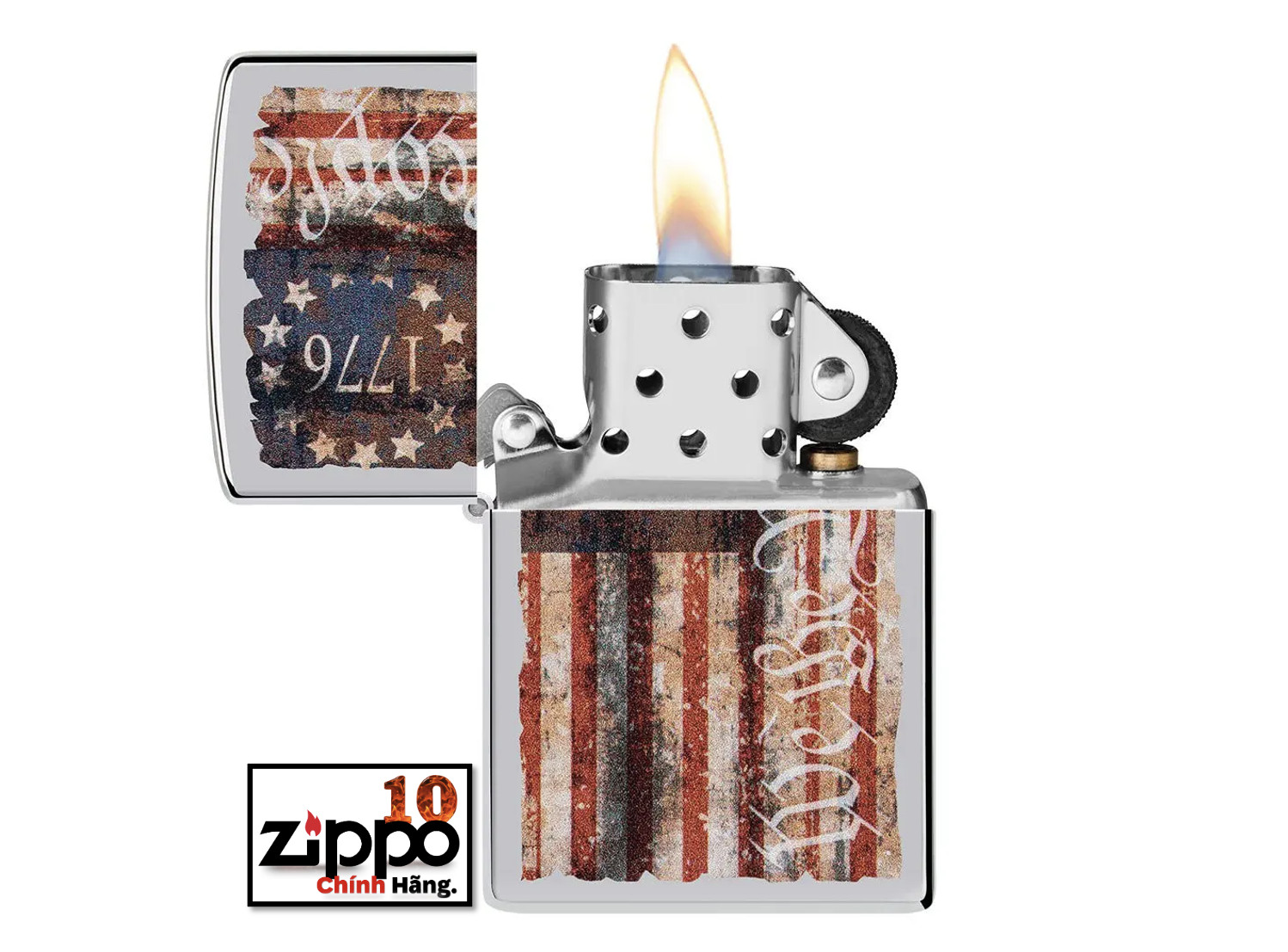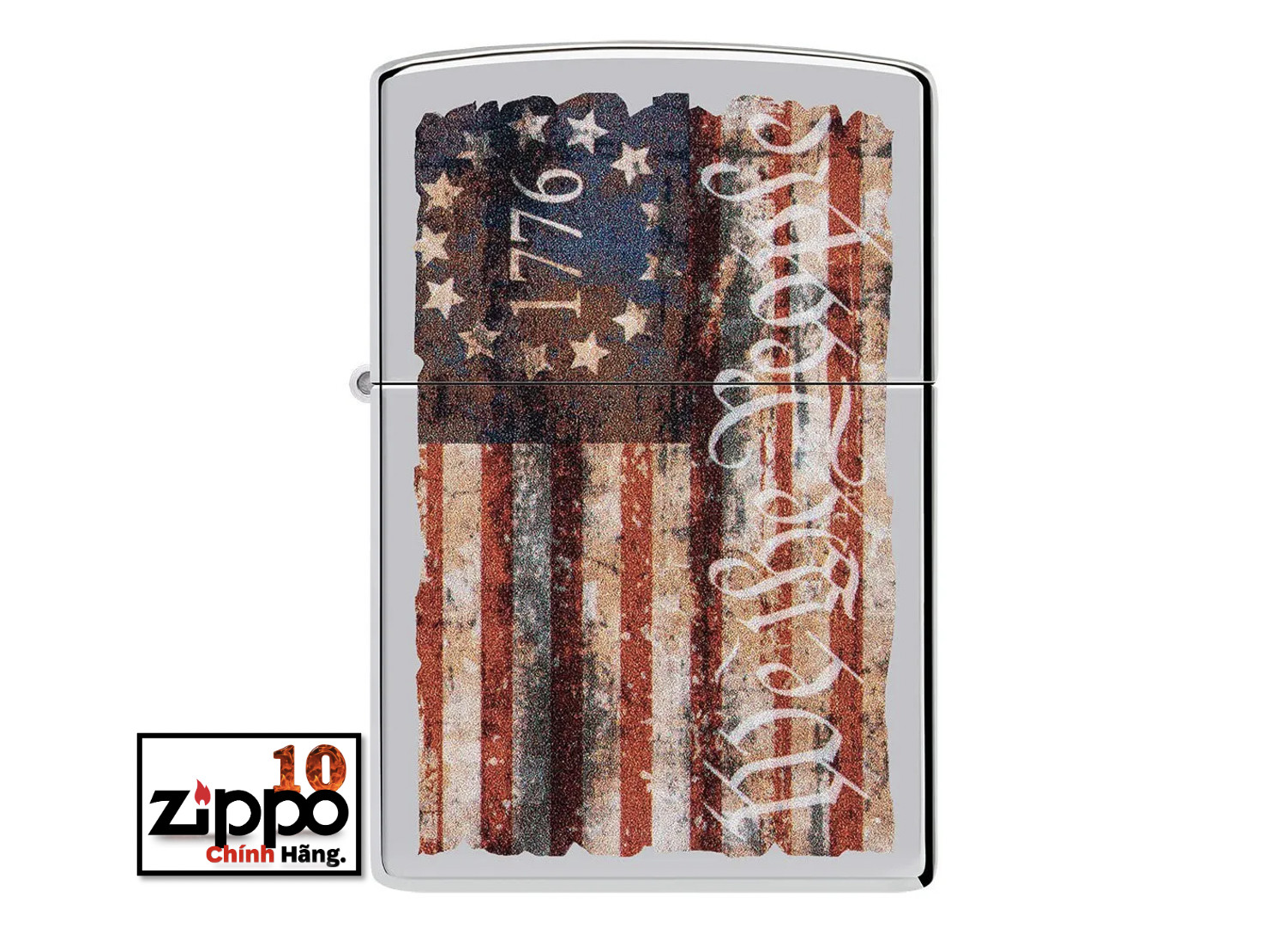 Sử dụng quy trình in hình ảnh màu đã được thử và được thực hiên của Zippo, chiếc bật lửa Chrome High Polish này mang lá cờ Mỹ lấy cảm hứng từ Betsy Ross với năm 1776 và dòng chữ “We the People” như một lời nhắc nhở về các quyền tự do của nước Mỹ. Được đóng gói trong một hộp đựng dạng quà tặng. Để tối ưu hiệu suất, hãy dùng nhiên liệu bật lửa của Zippo.