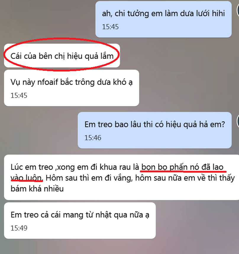 - Trang Trại dưa lưới tại Lam Sơn, Củ Chi, Hóc Môn, Long An đã được sử dụng và mang lại hiệu quả với thời gian trên 6 tháng chịu mưa nắng. Ngoài bẫy ruồi còn tiết kiệm được chi phí về giá và về nhân công