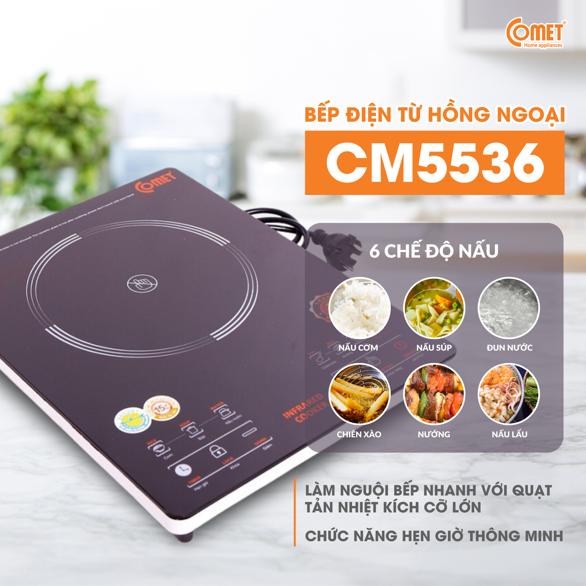 - Bếp hồng ngoại đa chức năng Comet CM5536 cực kỳ an toàn với khả năng tự ngắt điện khi quá tải. Bếp hồng ngoại Comet CM5536 đã được kiểm nghiệm tiết kiệm năng lượng hơn 40-60% so với các loại bếp thông thường và đặc biệt không gây bức xạ, không có lửa, không thải khí CO2 cực kỳ thân thiện với môi trường, an toàn cho sức khỏe người sử dụng.