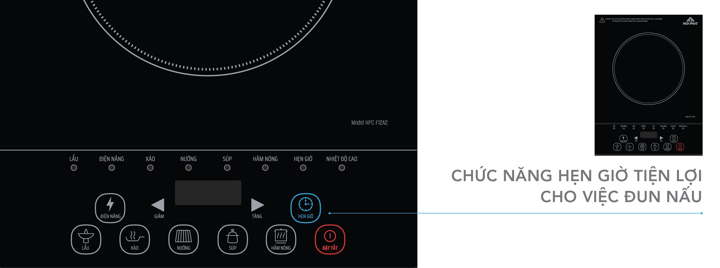 Chức năng hẹn giờ thông minh Chức năng hẹn giờ giúp bạn tắt bếp sau khoảng thời gian đã định. Bạn chỉ cần ước lượng thời gian nấu và hẹn giờ nấu thích hợp cho từng món ăn mà không cần phải mất thời gian chờ tắt bếp mà món ăn vẫn được hoàn thành ngon lành.