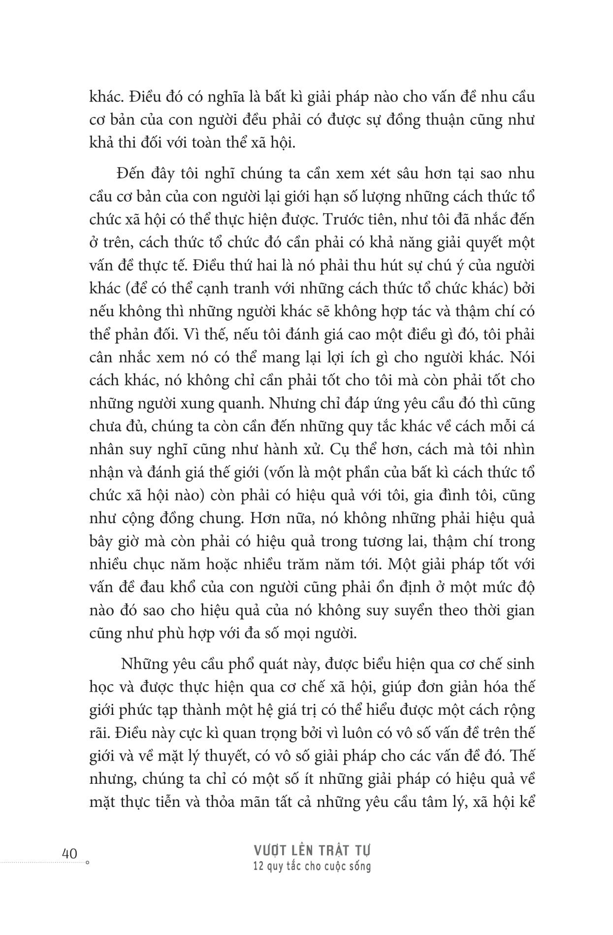 Vậy là cuốn sách tiếp – Vượt Lên Trật Tự của Giáo sư Jordan Peterson ra đời như một liều thuốc giải giúp bạn giải quyết những biến động, rối loạn và bất định. Vẫn là 12 quy luật, nhưng khác với “12 rules for life”, 12 bộ quy tắc củhư một “cứu cánh” giúp bạn nhận ra rằng trật tự thực ra rất mong manh, rằng “Con người vốn yếu đuối. Vì thế, cuộc sống luôn khó khăn và đau khổ thì đầy rẫy.” Và “để xoa dịu những khổ đau đó (như đảm bảo mọi người đều có đủ thức ăn, nước sạch và một nơi ở đàng hoàng, sạch sẽ), chúng ta cần đến sự mạnh dạn sáng tạo, nỗ lực và năng lực.”