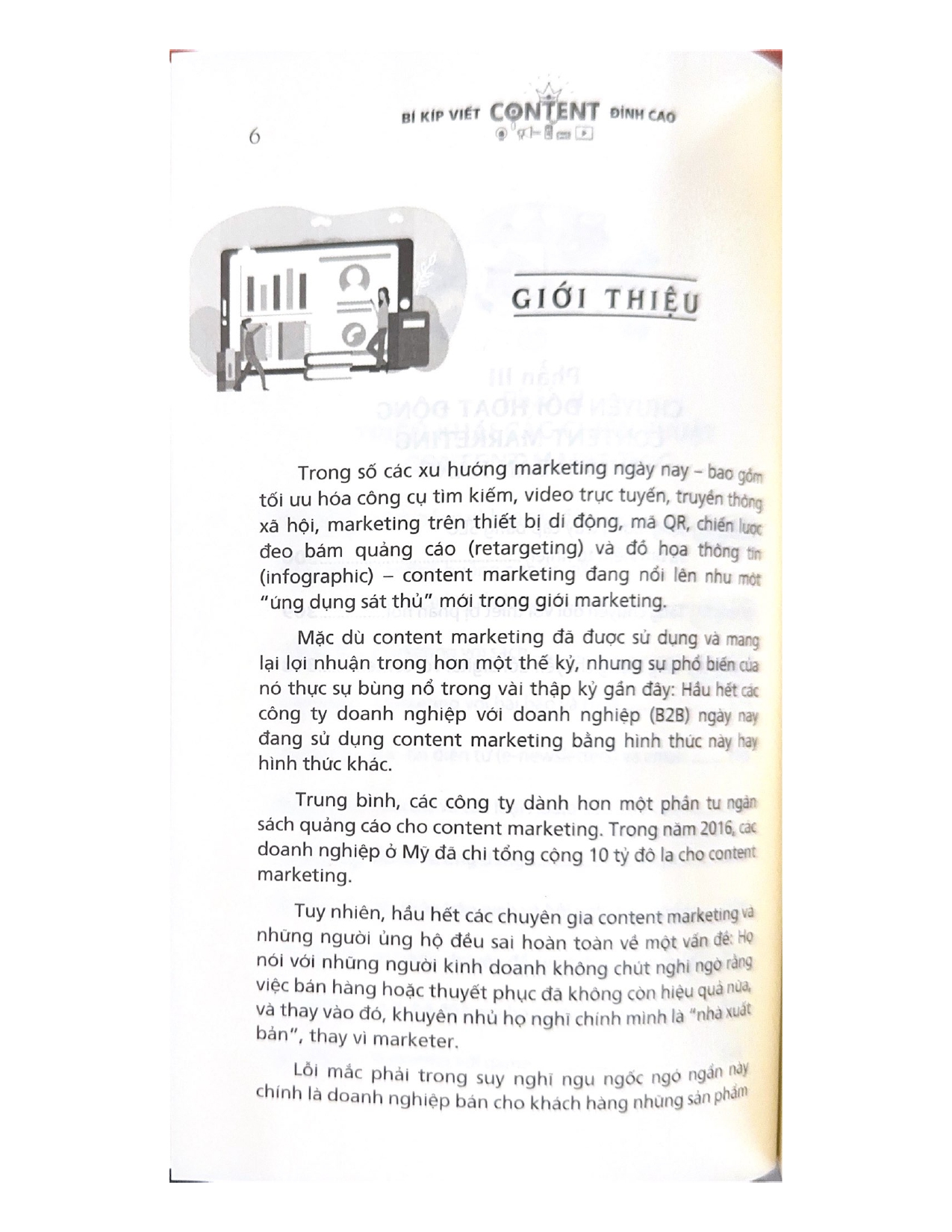 Bí Kíp Viết Content Đỉnh Cao giúp các doanh nhân, marketer và chủ doanh nghiệp nhỏ hiểu được vai trò thực sự của content trong các chiến dịch marketing đa kênh tích hợp, tránh lãng phí thời gian và tiền bạc bằng cách cứ tạo content mà không có tỷ suất hoàn vốn (ROI). Thay vào đó, sách hướng dẫn cách tạo và cung cấp nội dung để xây dựng lòng tin, kích thích sự quan tâm của khách hàng, và chạm đến mục đích cuối cùng của việc kinh doanh là bán hàng.