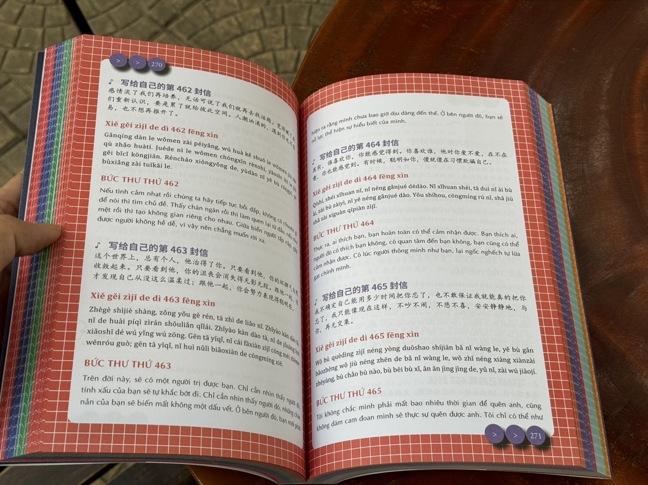 Giờ đây, nhằm đáp ứng nhu cầu của những độc giả có niềm yêu thích ngôn ngữ Trung Quốc, Vanvietbooks hân hạnh ra mắt “999 lá thư gửi cho chính mình” – Phiên bản Song ngữ toàn tập với đầy đủ 999 lá thư chỉ trong 1 cuốn sách duy nhất! Được lấy cảm hứng từ chiếc tủ sách – tượng trưng cho nguồn kiến thức dồi dào, mới lạ đang chờ đón bạn khai phá - từng trang sách chính là từng ô tủ chứa đựng những lá thư thân quen không chỉ mang tính truyền cảm hứng sống mà còn “đính kèm” cả Hán tự và phiên âm được trình bày khoa học, hợp lý và đẹp mắt, là một công cụ rất tốt để giúp bạn đọc rèn luyện và nâng cao khả năng ngoại ngữ, trau dồi kiến thức, đúng với tiêu chí giúp bạn trở thành phiên bản hoàn hảo nhất của chính mình.