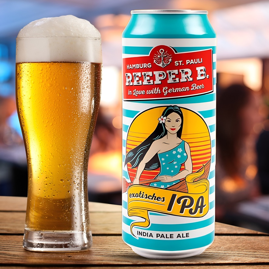 Reeper B. Exotisches - Bia IPL Nồng độ: 5.0% IBU (độ đắng): 24.0 Plato (độ ngọt/đường): 11.6 Dung tích: 500ml - Quy cách: 24 lon/thùng  Nhập khẩu chính ngạch Đức   Màu sắc: Bia có