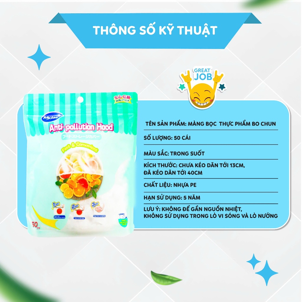 Chất liệu nhựa PE cao cấp dẻo dai Thiết kế thông minh với viền bo chun co giãn cực tốt. Dễ dàng bọc kín miệng các loại bát, tô, đĩa, hộp,... mà không cần kéo