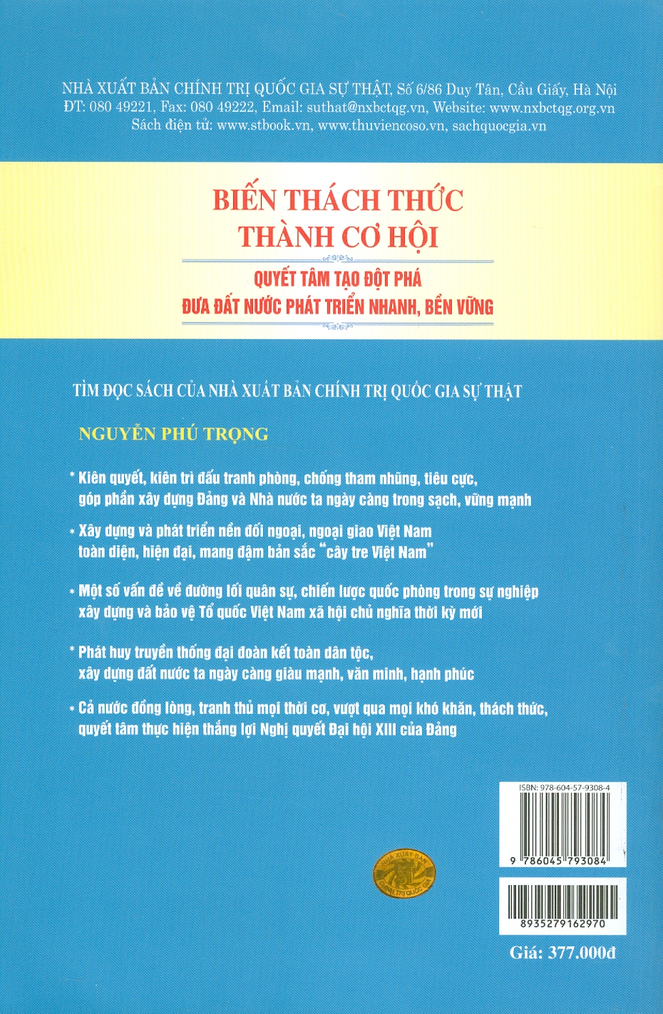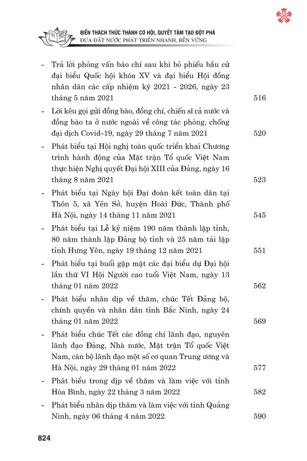 Cuốn sách “Biến thách thức thành cơ hội, quyết tâm tạo đột phá đưa đất nước phát triển nhanh, bền vững” tuyển chọn các bài phát biểu, bài viết, bài trả lời phỏng vấn, thư,