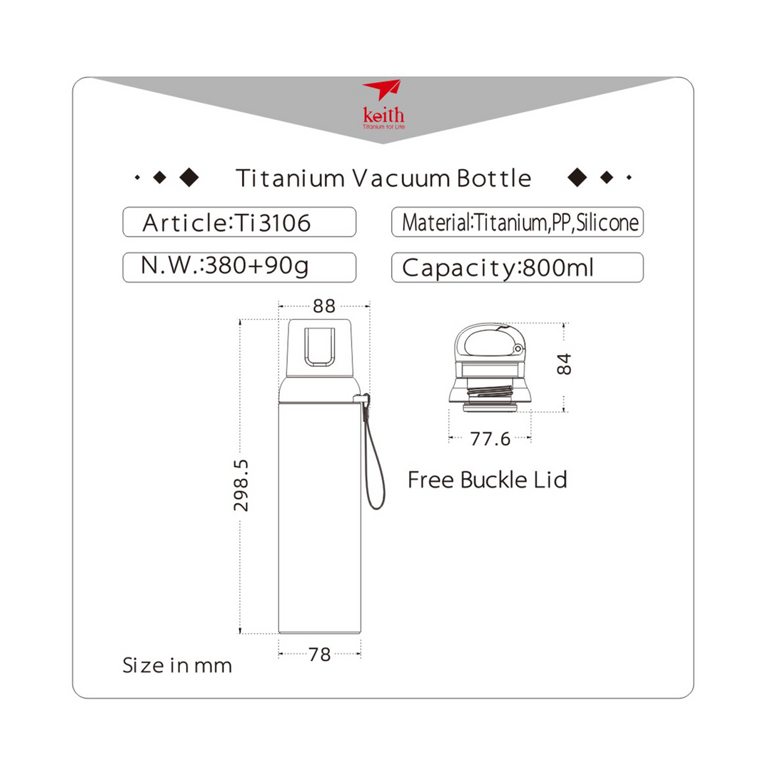 THÔNG TIN SẢN PHẨM:- Thương hiệu: Keith Titanium- Xuất xứ: Trung Quốc- Chất liệu: Titanium- Kích thước: 298.5 × 78 × 88 mm- Trọng lượng: 380 + 90 g- Dung tích: 800ml | 27 fl oz* Thiết kế FlexLi...