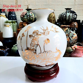 Bình hút tài lộc phong thủy Sen vàng phú quý vẽ vàng 24k, gốm sứ Bát Tràng cao cấp (H26xD24cm)