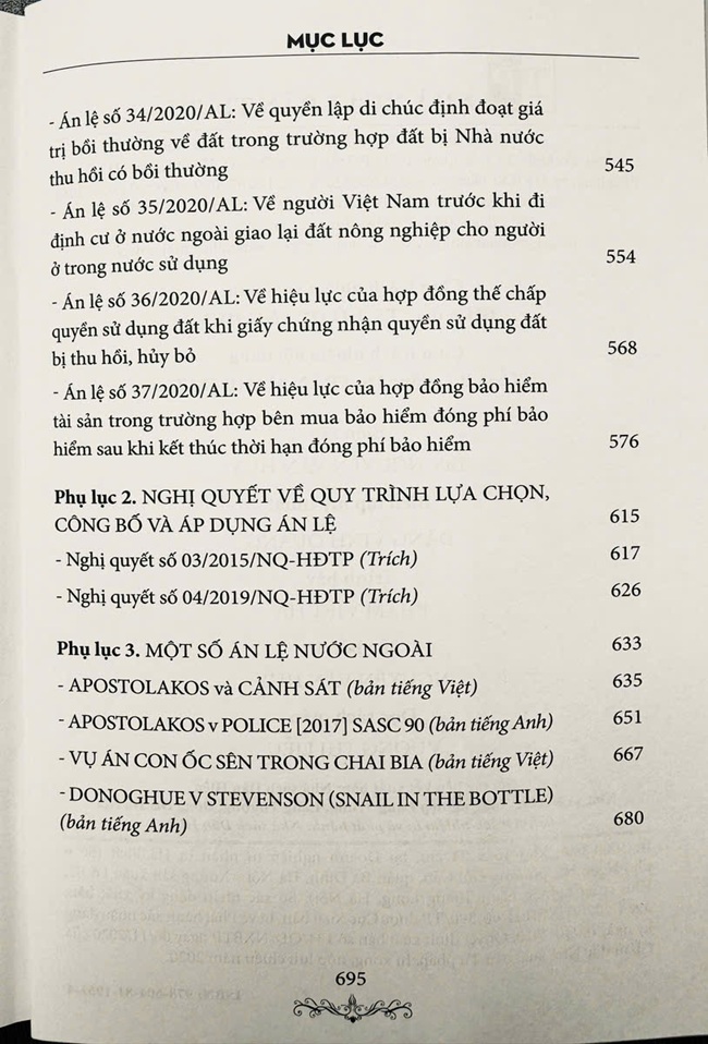 Hy vọng cuốn sách sẽ đáp ứng được phần nào nhu cầu của đông đảo bạn đọc, trước hết là các cán bộ trong các cơ quan tư pháp, các luật sư, các nhà nghiên cứu, các giảng viên, sinh viên luật... trong việc tìm hiểu, nghiên cứu, tham khảo, ứng dụng các án lệ đã được công bố; đồng thời, giúp người dân có thêm vốn kiến thức pháp luật về các tình huống tranh chấp được chọn là án lệ, có thể tự bảo vệ quyền và lợi ích hợp pháp của mình một cách tốt nhất.