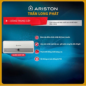 - Tên sản phẩm: Bình nóng lạnh Ariston Slim3 20 RS 20 Lít SL3 - Mã sản phẩm: SLIM3 20 RS - Thương hiệu: Ariston - Loại bình: Bình nóng lạnh Gián tiếp - Dung tích: 20 Lít - Loại Bình: Bình Ngang - Công suất: 2500W - Điện năng: 220V - Thời gian gia nhiệt (∆T = 45◦C) : 25 phút - Nhiệt độ làm việc tối đa: 80 ◦C - Áp suất làm việc tối đa: 0.8 Mpa - Chỉ số bảo vệ chống xâm nhập: IPX24 - Khối lượng tịnh: 11.6 kg - Tổng khối lượng: 13.6 kg - Kích thước: 702x291x299mm (Dài x Cao x Sâu) - Thời gian bảo hành: 2 năm phụ kiện - Loại bảo hành: điện tử Thanh đốt 100% đồng.