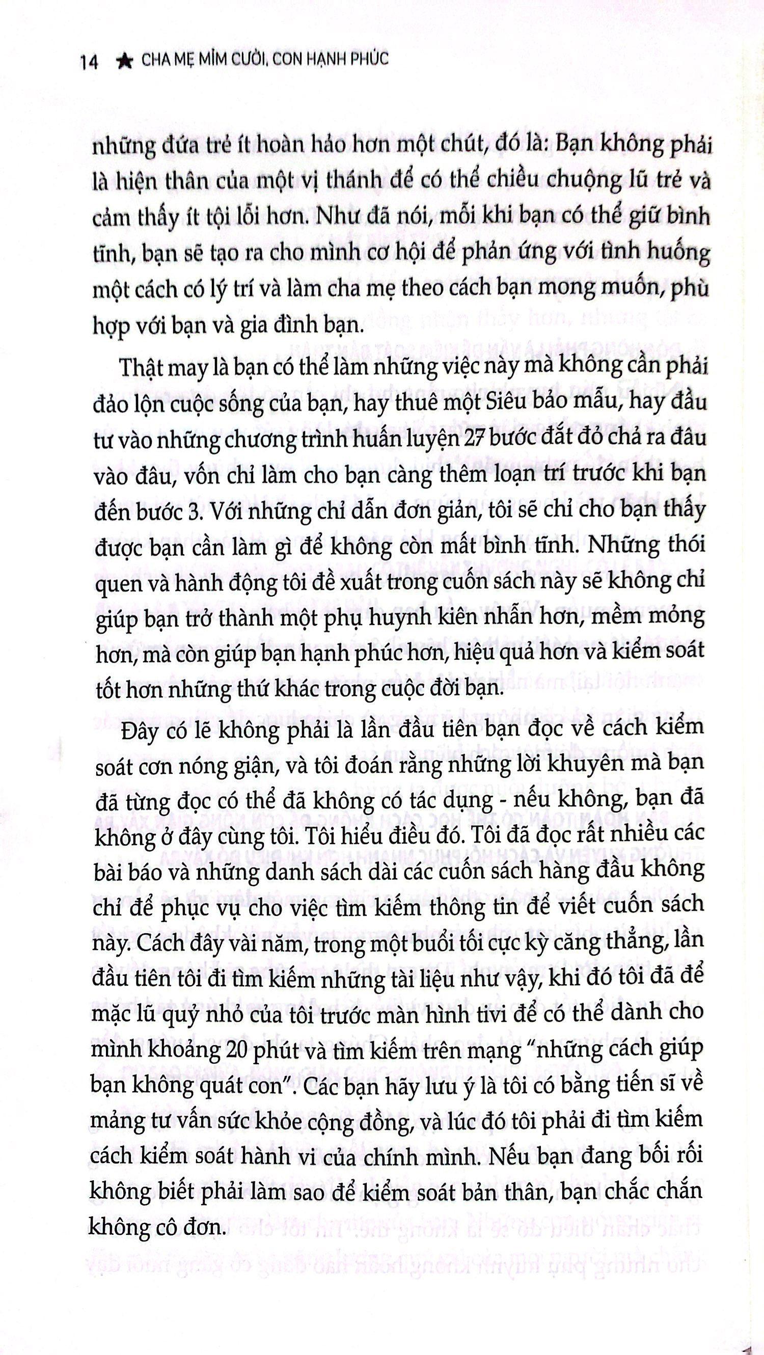 Cuốn sách chỉ ra những điểm kích hoạt phản ứng thiếu kiểm soát của cha mẹ đồng thời chỉ ra các phương pháp để cha mẹ bình tĩnh hơn, thư giãn hơn và cân bằng hơn trong khi giao tiếp và nuôi dạy con. Những lời khuyên không phải là mảnh ghép hoàn hảo cho bạn và cho gia đình. Nhưng những lời khuyên trong cuốn sách này có thể áp dụng cho nhiều đối tượng và dễ dàng điều chỉnh cho phù hợp với hoàn cảnh và lối sống của bạn.