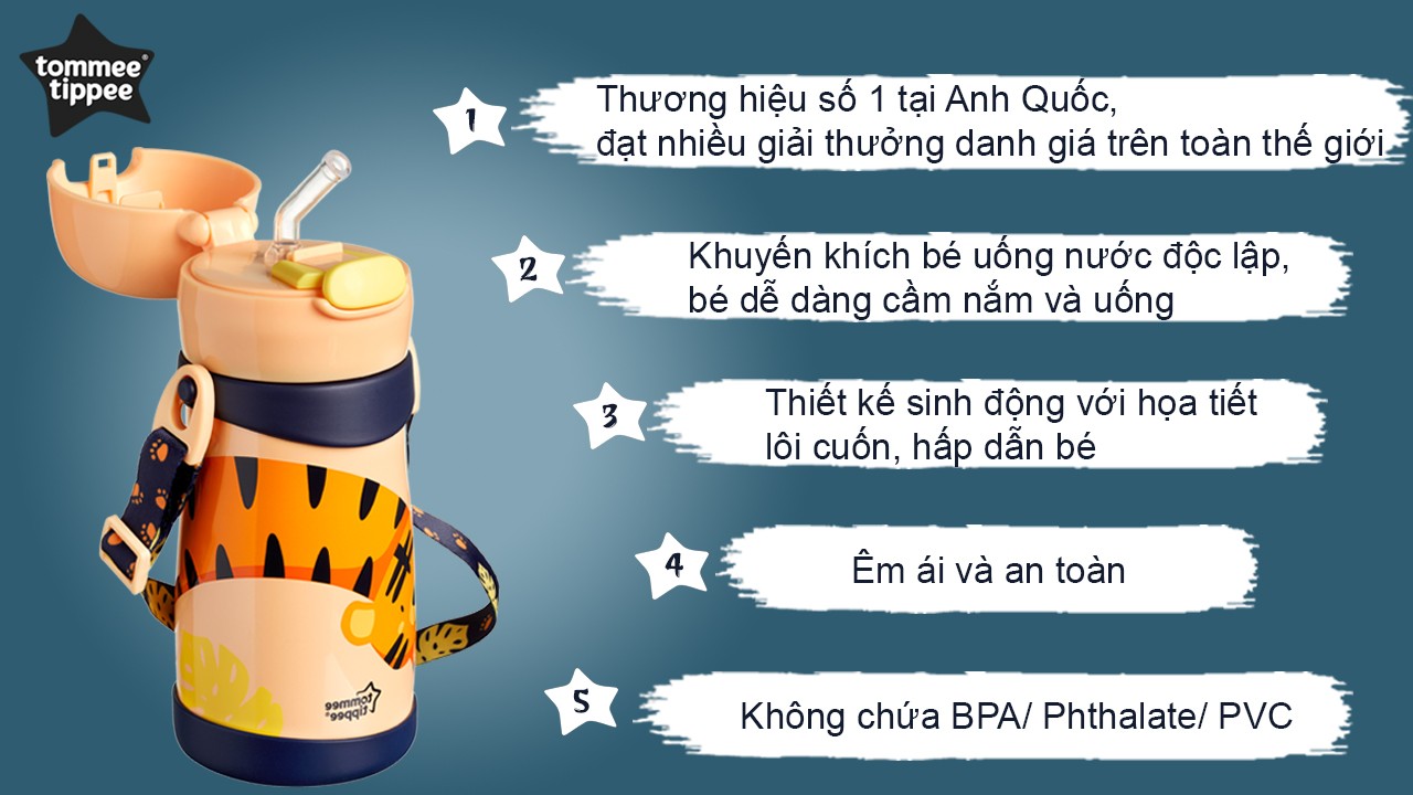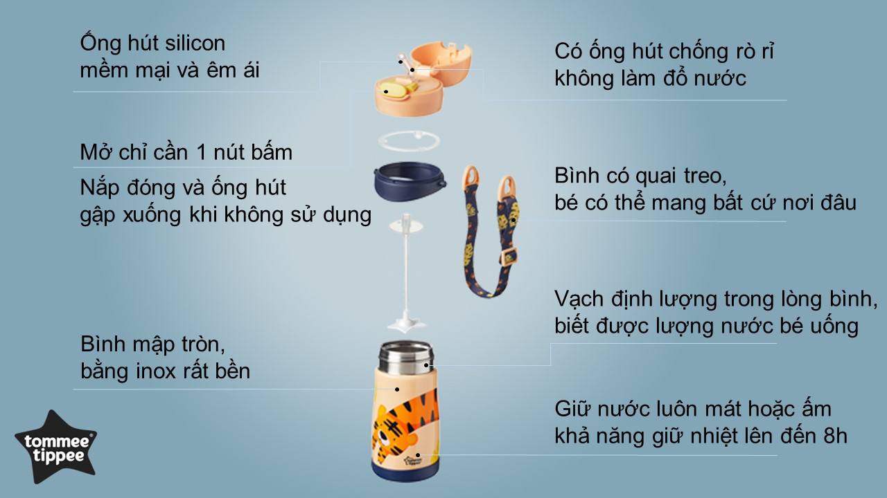 Đặc điểm bình uống nước Inox giữ nhiệt có ống hút và quai treo Tommee Tippee: