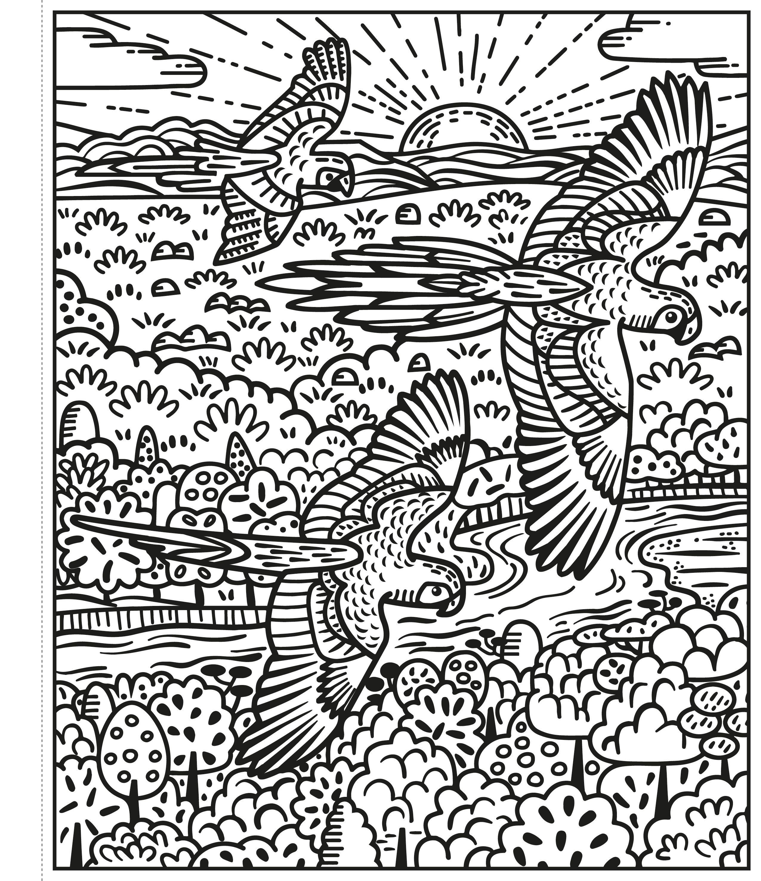 Filled with detailed scenes showing an array of brilliant birds, from flamingos and hummingbirds to kingfishers and macaws. Simply brush water over the black and white designs to reveal an array of vivid colours.