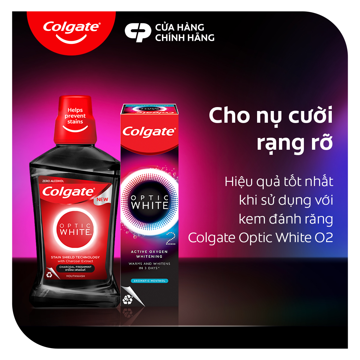 ** Nên kết hợp nước súc miệng Colgate với bàn chải Colgate và kem đánh răng Colgate trắng răng Optic White O2 để bảo vệ răng miệng toàn diện và cho hiệu quả làm trắng răng tốt nhất.