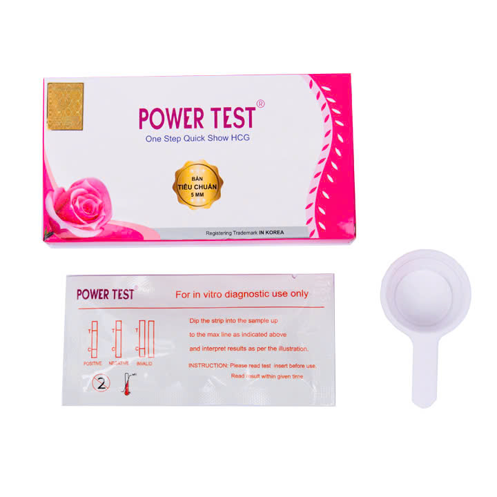 Tên sản phẩm: Que thử thai PowerTest Kích thước test: rộng 5mm Tính năng: Phát hiện thai sớm sau 6 -9 ngày trứng rụng ƯU ĐIỂM: Phát hiện thai sớm sau 6 -9 ngày