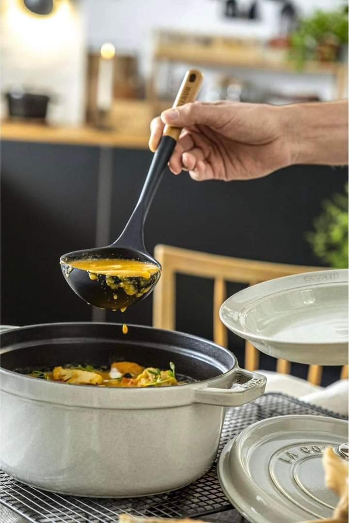 Được yêu thích bởi các đầu bếp chuyên nghiệp và gia đình, Staub đã dồn hết chuyên môn của mình vào một dòng dụng cụ và phụ kiện nhà bếp mới giúp tôn lên các dụng cụ nấu nướng bằng gang của mình. Tay cầm của dụng cụ nấu ăn Staub được làm từ gỗ tự nhiên Acacia thân thiện với môi trường với thiết kế hoàn hảo vừa vặn với bàn tay, nồi và bát, phần đầu được làm bằng silicone đen mờ chịu nhiệt và an toàn khi sử dụng trên mọi bề mặt dụng cụ nấu nướng