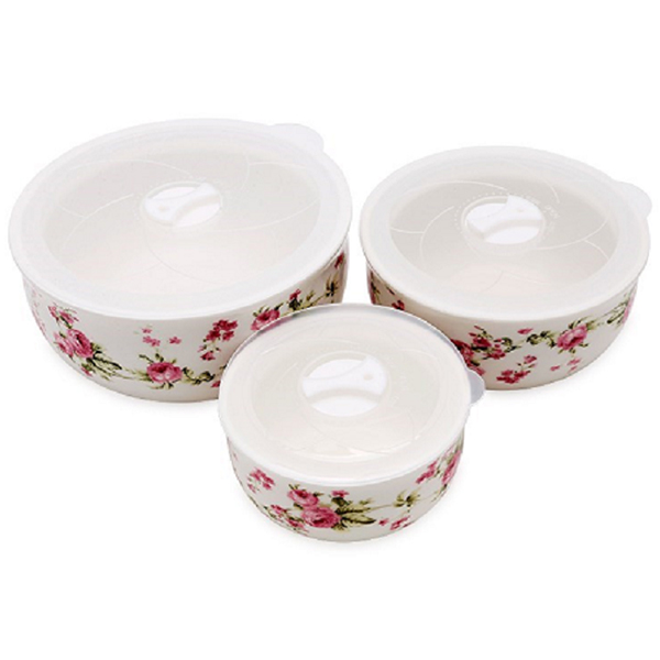 Bộ 3 thố sứ có nắp đậy chân không chặt. Bộ sản phẩm gồm 3 chiếc bát có kích thước khác nhau, có thể sử dụng bát với nhiều mục đích khác nhau: đựng canh,