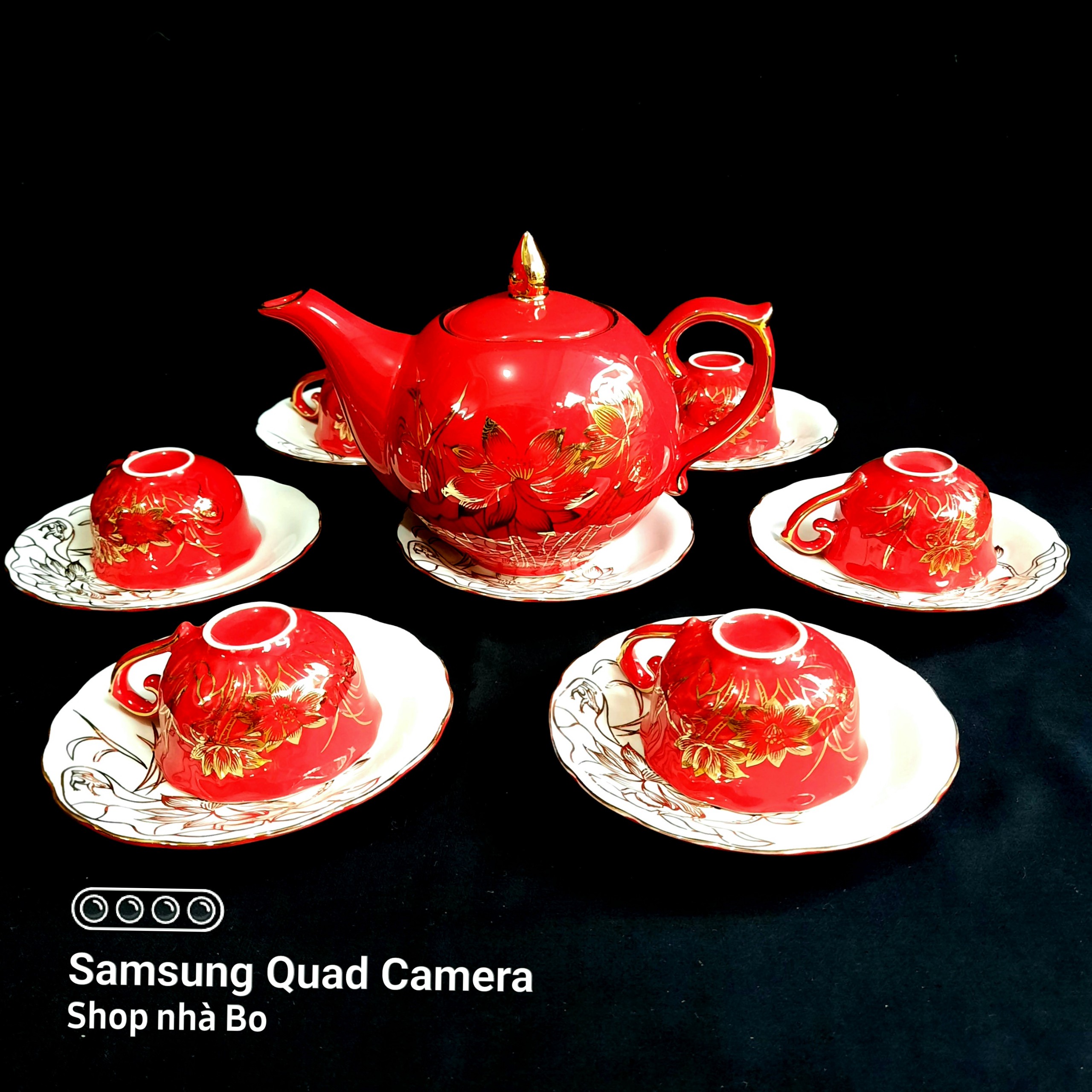 Bộ ấm chén Bát Tràng cao cấp mẫu đơn đỏ vẽ sen vàng được thiết kế hoàn toàn khác biệt, thích hợp với những người yêu thích màu đỏ. Phù hợp sử dụng trong các không gian sang trọng như phòng khách lớn, phòng hội họp… với bình trà lớn đáp ứng cho 8-10 người sử dụng. được chế tác tinh sảo rất tỉ mỉ do những nghệ nhân có kỹ thuật, tay nghề vô cùng điêu luyện có thể làm hài lòng nhữngkhách hàng khó tính nhất.
