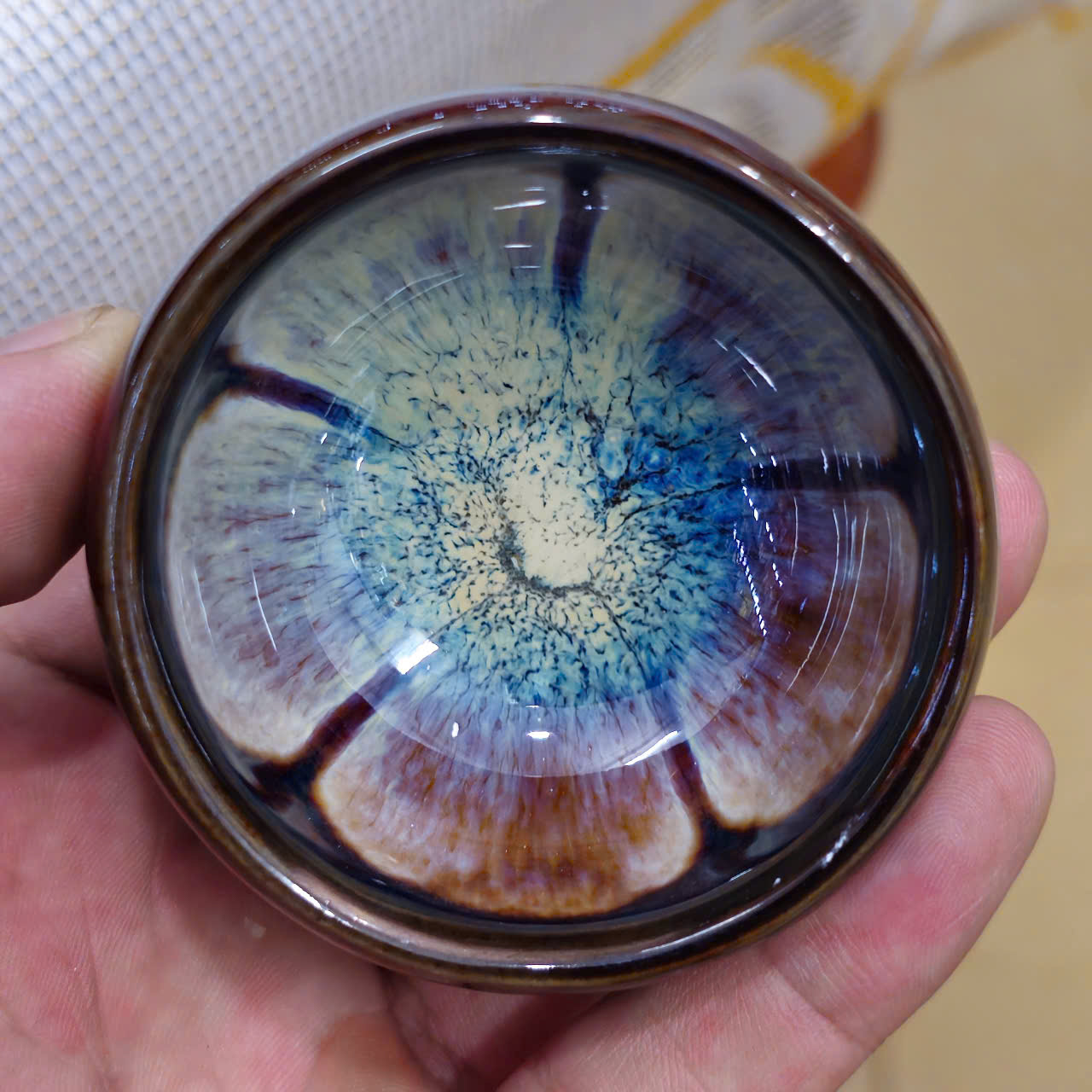 - Mỗi chén được làm thủ công với men đen bóng, đồng bộ với ấm trà.
