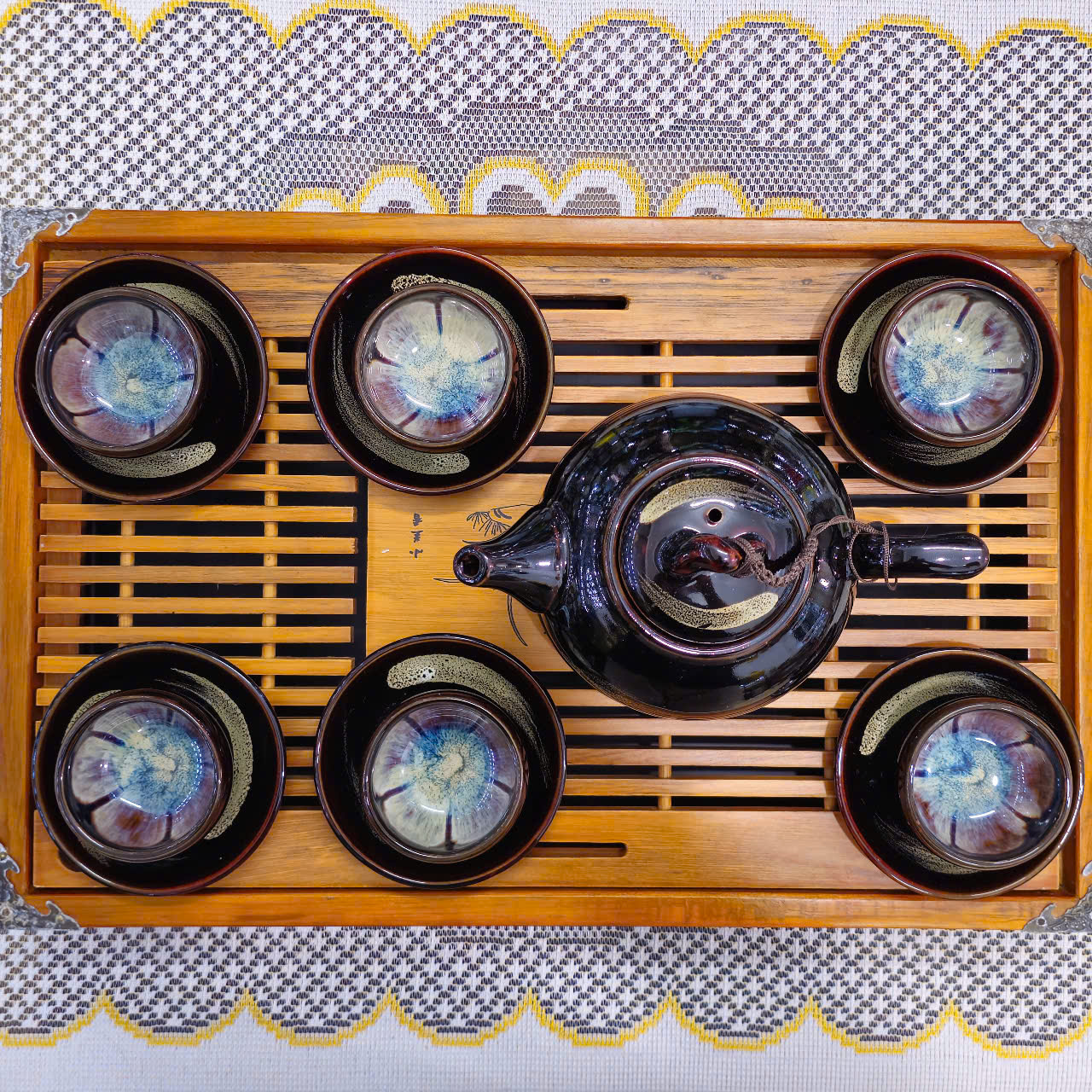 Bộ ấm chén gốm Bát tràng men đen hoả biến phẩy gấm chén lòng hoa full phụ kiện siêu đẹp!