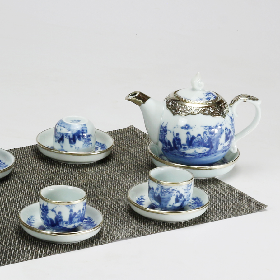 Bộ ấm trà men lam trắng bát tràng được vẽ họa tiết cổ với tích “trúc lâm thất hiền” là một trong những bộ ấm trà thông dụng của làng cổ Bát Tràng. Họa tiết