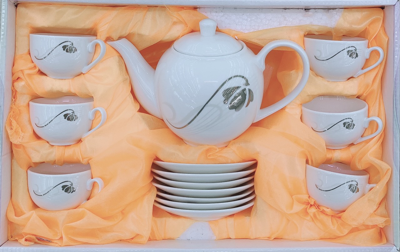 Một bộ sản phẩm bao gồm: 01 ấm, 01 đĩa ấm, 06 chén và 06 đĩa chén.    Bộ sản phẩm được làm từ chất liệu gốm cao cấp, bảo đảm an toàn vệ sinh