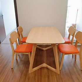 Mô tả sản phẩm - Kích thước bàn 1,2m*75cm, cao 75cm - Kích thước ghế 45*45*80cm - Chất liệu gỗ cao su tự nhiên, chất liệu nệm: simili - Mặt bàn HDF Lỗi xanh -