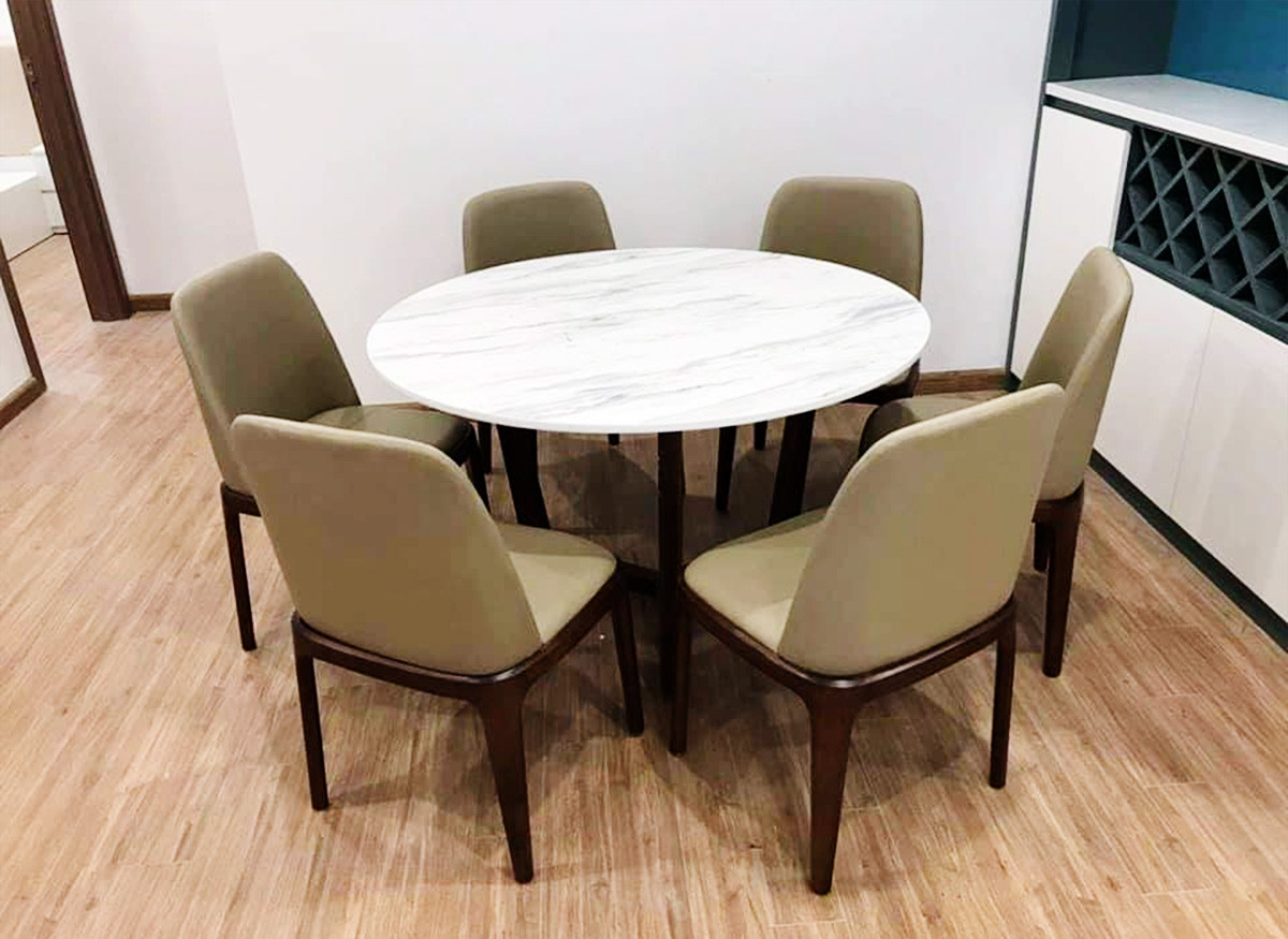 Chất liệu: Bàn ăn có mặt đá tròn màu trắng tạo cảm giác sang trọng đẳng cấp