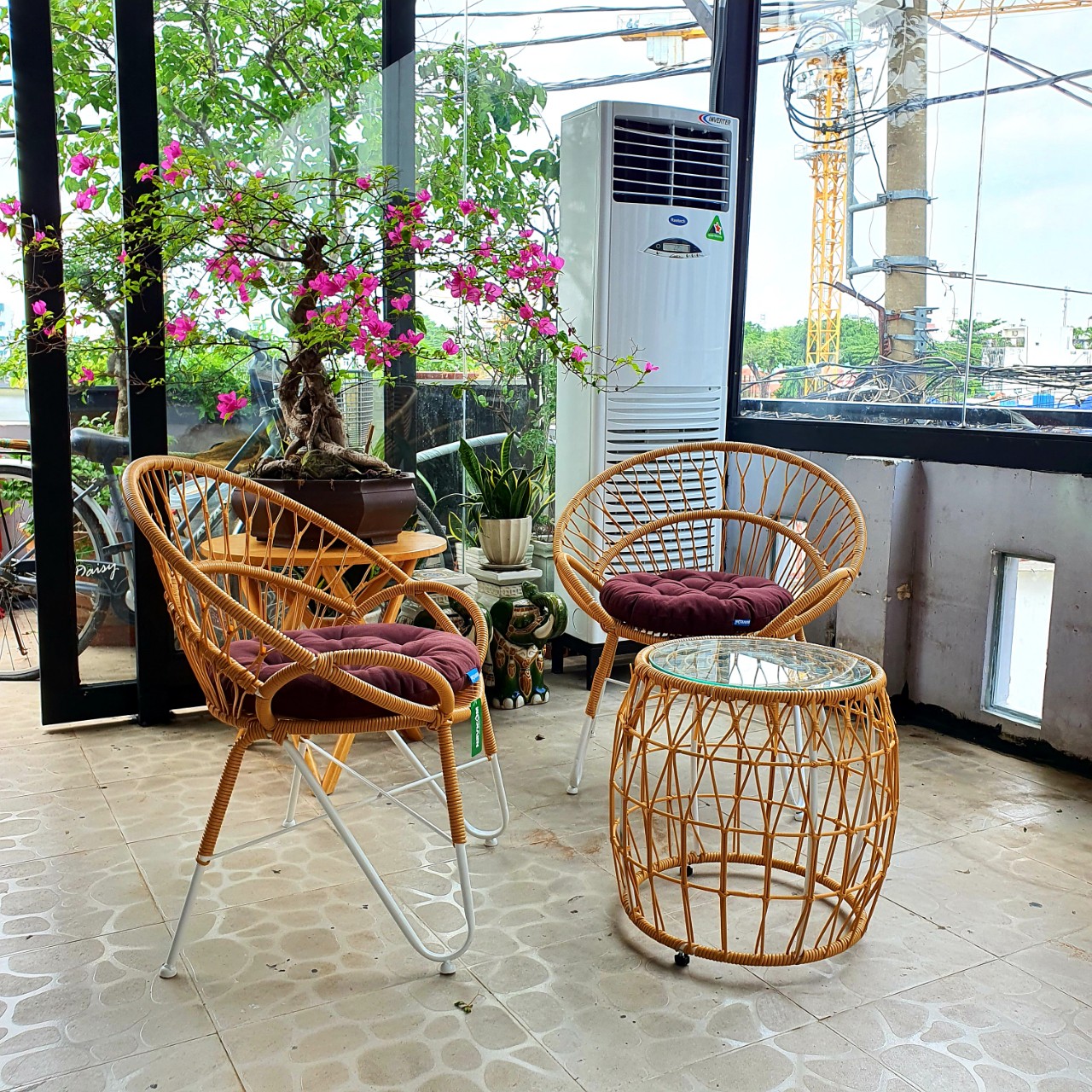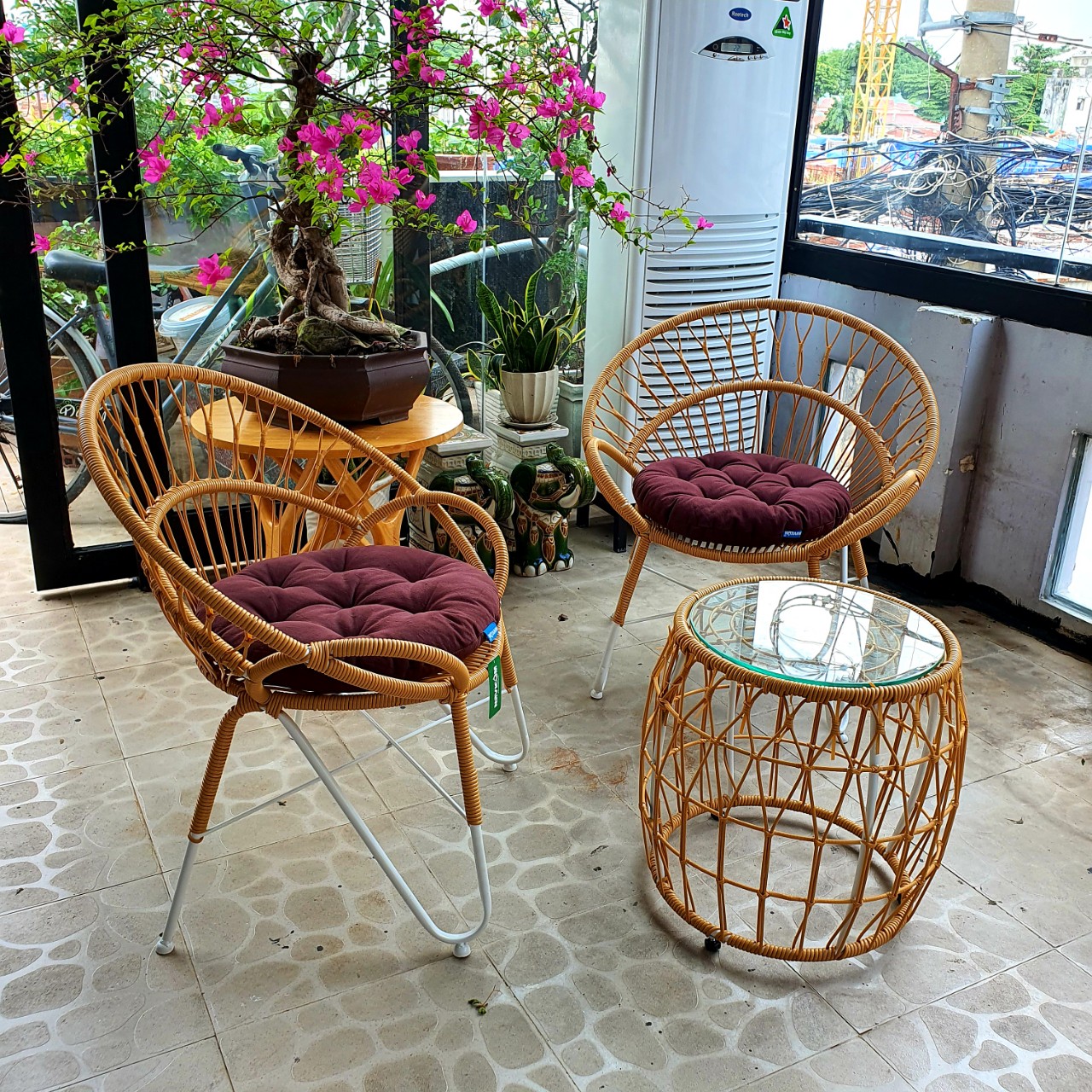 Mua tại TiktokBộ sản phẩm gồm : 01 bàn kính + 02 ghế kèm 02 nệm như hình màu sắc như hình Tính thẩm mỹ được khẳng định rõ nét trong không gian ngôi nhà của bạn. Bạn được tận dụng cảm giác giãn thật sự mỗi khi cùng nhau nghỉ ngơi sau những giờ làm việc căng thẳng Ghế ngoài trời cao cấp là giải pháp lý tưởng về cách thức trang trí sân vườn, cảnh quan sống hiện đại. Hãy để Navicom đồng hành cùng bạn trong quá trình kiến tạo không gian sống sang trọng, tiện nghi và thoải mái nhất. Chất liệu Khung Sắt + mây PE+ Gối vải Gối vải màu sắc ngẫu nhiên Kích thước ghế: 700 x 700 x 800 mm Kích thước bàn: 550 x 550 x 420mm Chất liệu: Sắt đặc sơn tĩnh điện, dây vinyl nguyên sinh Tạo cảm giác êm ái, sảng khoái cho người sử dụng